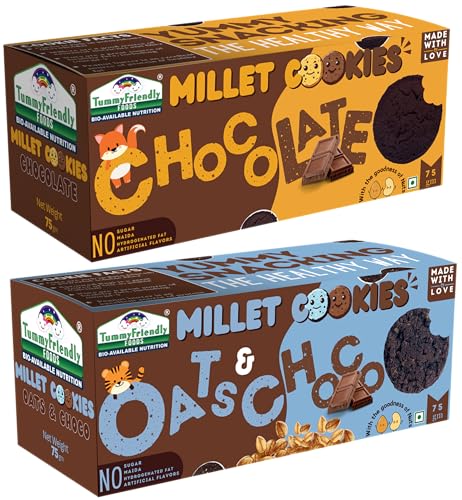 Tummy Friendly Foods Millet Cookies - Chocolate, Oats-Chocolate - Pack of 2 - 75g each. Healthy Ragi Biscuits, snacks for Baby, Kids & Adults