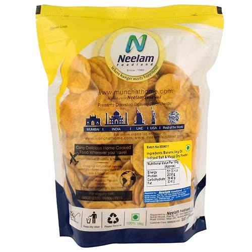 Neelam Foodland Crispy and delicious Low Fat Maggi Masala Flavoured Banana Chips made with the best quality ingredients. An ideal appetizing Snack that every age person would love to have at any time. Carry Chips Pouch along with you to enjoy in Breaks Traveling Picnics or Movies. It can be enjoyed plain or with dips Coffees Juice and milkshakes. Tea-time is never complete without dry snacks. Enjoy them at your next party. Spice up your Mood with a variety of snacks from Neelam Foodland.