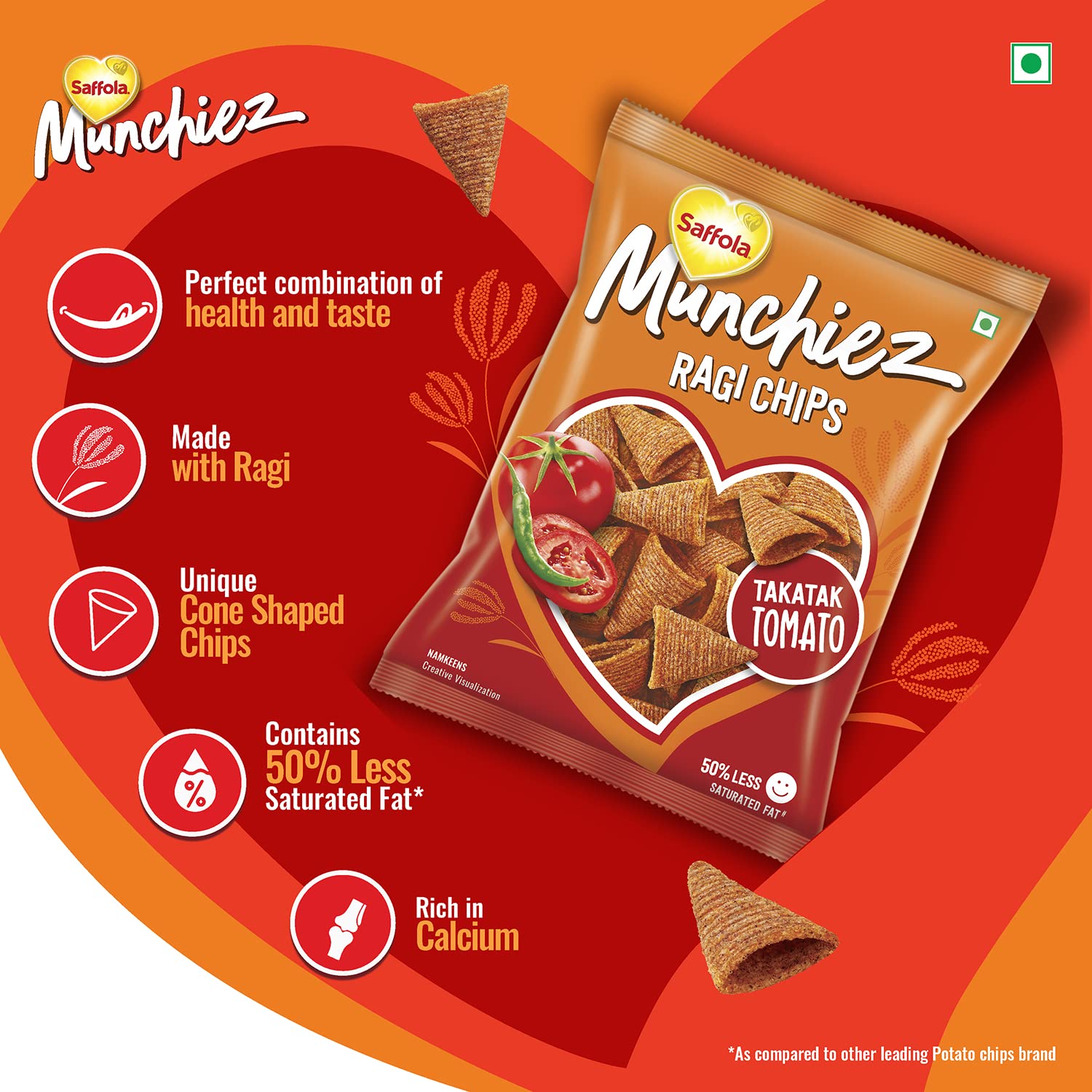 Saffola Munzhiez is a range of tasty and healthy snacks that you love in flavours that you crave. Whether you need a quick hunger fix in between your meals or want something to accompany your late-night binge of your favourite series or want to share snacks during your hang out with friends Saffola Munchiez is the perfect partner for all such occasions. The Ragi Chips range of products have been made with Ragi - the king of all grains. It is a 4000-year-old indigenous grain that is high on nutrition needs minimum fertilisers to grow and uses very little water. It is thus good for the consumer the farmer and mother nature. We retained the benefits of Ragi and converted it into unique cone shaped chips and seasoned them with mouth-watering masala and tomato flavours. Saffola Munchiez Ragi Chips contains 50% less saturated fat as compared to other fried potato chips in the market. It is also high in calcium and a source of fiber. Try out our other product range of Saffola Munchiez Roasted Makhana also and dive into a mouth wateringly delightful snack-time!! Let's go munching with Saffola Munchiez!