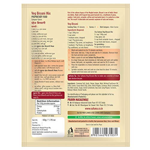 Suhana Veg Biryani Spice Mix: Part of the culinary legacy of the Mughal empire Biryani is one of India's finest rice dishes. Made with fragrant long garin basmati rice a multitude of spices yoghurt fresh mint coriander saffron and marinated meat it is coo
