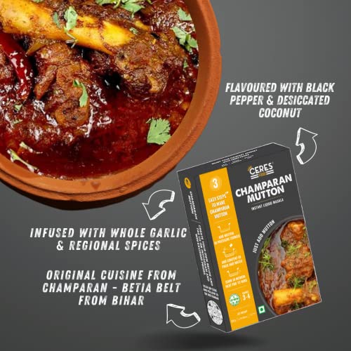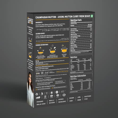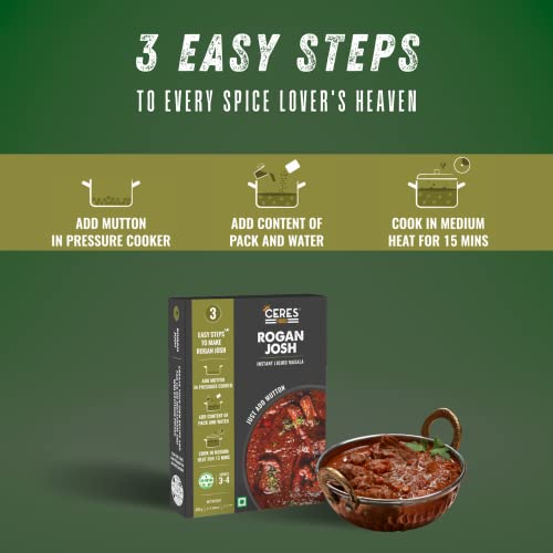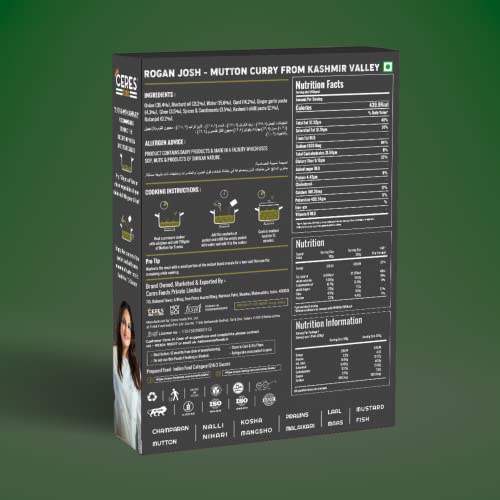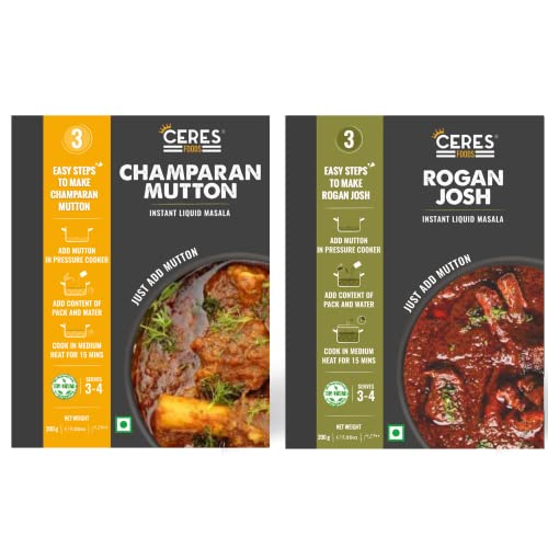 Rogan Josh: Onion (35.4%) Mustard oil (21.2%) Water (15.6%) Curd (14.2%) Ginger garlic paste (4.3%) Ghee (3.5%) Spices & Condiments (3.5%) Kashmiri chilli paste (2.1%) Ratanjot (0.2%) Champaran Mutton: Onion (36.5%) Water (26)mustard oil (15.6%) Butter (8