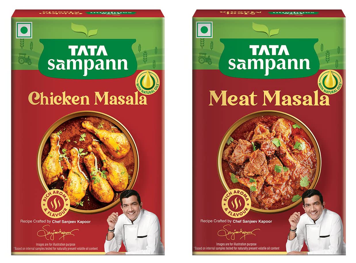 Tata Sampann Chicken Masala with Natural Oils Crafted by Chef Sanjeev Kapoor 100gTata Sampann Chicken Masala is specially crafted for you by Chef Sanjeev Kapoor to unleash the master chef within you. Tata Sampann spices are made to retain their natural oils ensuring each bite is aromatic and flavorful. Each pack comes with an exclusive Chef Tip to make every meal exciting! Now make tasty Chicken Curry at home and watch everyone lick their plates clean! Explore Tata Sampann Blended Spices Range â Pav Bhaji Masala Paneer Masala Chhole Masala Chaat Masala Dal Tadka Masala Meat Masala Kitchen King Masala and Garam Masala. Chef's Tip: Use fried onion paste instead of chopped onions to add a different dimension to the dish.Tata Sampann Meat Masala with Natural Oils Crafted by Chef Sanjeev Kapoor 100gTata Sampann Meat Masala is specially crafted for you by Chef Sanjeev Kapoor to unleash the master chef within you. Tata Sampann spices are made to retain their natural oils ensuring each bite is aromatic and flavorful. Each pack comes with an exclusive Chef Tip to make every meal exciting! Now make mouth watering Mutton Masala at home and watch everyone lick their plates clean! Explore Tata Sampann Blended Spices Range â Pav Bhaji Masala Paneer Masala Chhole Masala Chicken Masala Dal Tadka Masala Chaat Masala Kitchen King Masala and Garam Masala. Chef's Tip: Marinate the mutton with ginger-garlic paste and Mutton Masala for 15-20 minutes to add a depth of flavours.