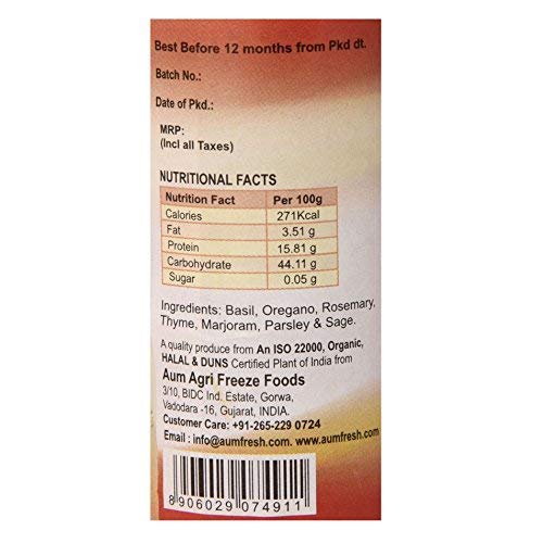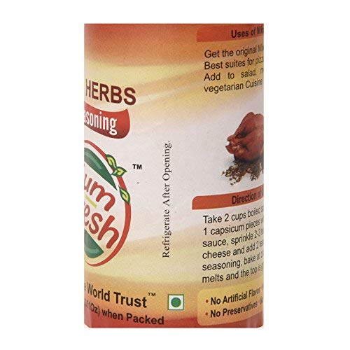 Mix Herbs Seasoning - 100% Pure & Natural 10 gm No artificial flavour & -when compared with sun dried or freeze dried our products are found to yield all the qualities like color, flavor, aroma, taste, rehydration ,nutritional values and increased shelf life property to an unmatchable extent taking it very close to the fresh ones and makes our technology the best drying technology of the present era. is committed to supply quality products. We work with thousands of small family farmers in India to cultivate thousands of acres of sustainable organic farm land. By choosing products you are not only getting pure solid matter but also spiritual vibrations imbibed nanoscopically during processing. proves itself to be your right choice.