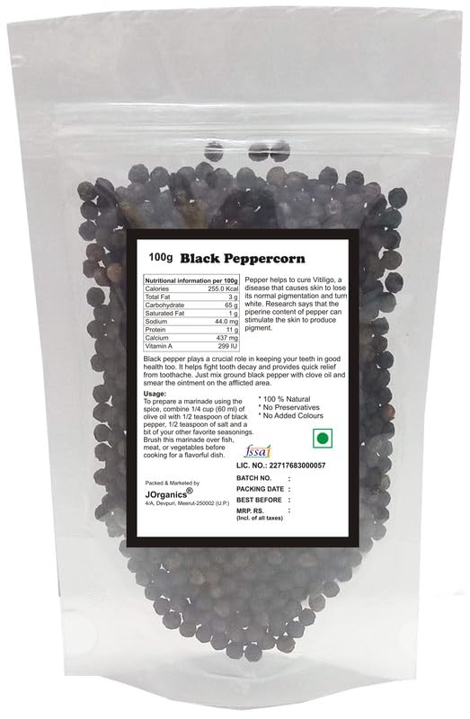 JOrganics Black Pepper Whole (Kali Mirch Sabut) is a natural dried spice that may help enhance the taste aroma and depth of your everyday cooking. Sourced from trusted farms and sun-dried for natural flavor preservation these whole black peppercorns are widely used in Indian households for seasoning masala preparation tadka and pickles. The robust flavor of sabut kali mirch can blend well with both vegetarian and non-vegetarian dishes. It may be a vital part of any khada masala mix used in gravies biryani pulao kadhai recipes and even Ayurvedic decoctions. When freshly crushed black peppercorns may help bring out a distinct sharpness and spice to your cuisine. It can also be paired with turmeric ginger or tulsi in herbal preparations for potential wellness benefits. This versatile spice is a kitchen staple that may support your cooking and seasoning needs while helping you explore traditional Indian recipes and wellness drinks.