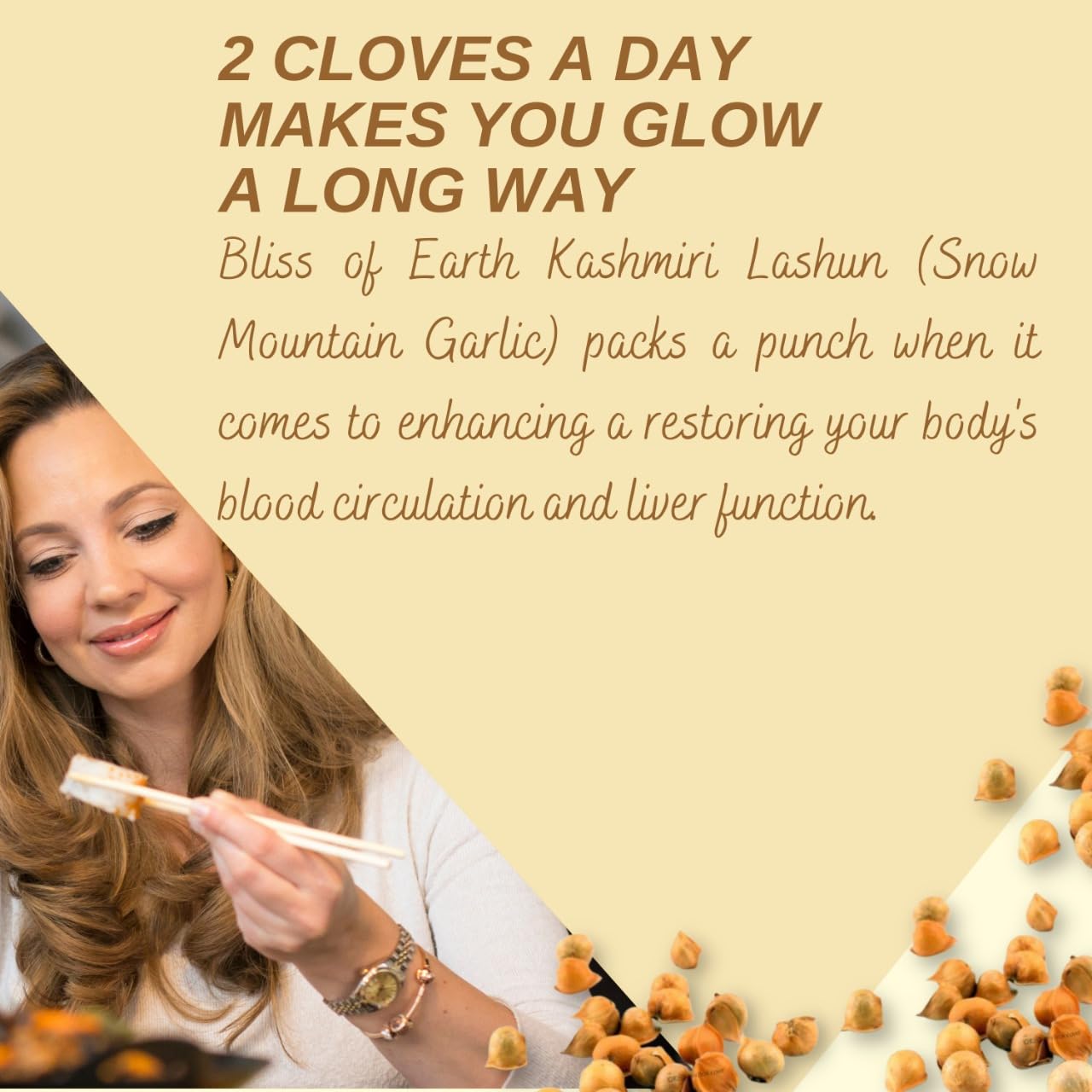 Bliss of Earth Kashmiri Lahsun or kashmiri garlic is a rare single clove varity of allium sativum. It is popolarly knows as snow mountain garlic of ek pothi lahsun in Hindi. Kashmiri garlic is an excellent source of vitamin B1 B6 C as well as copper selenium and phosphorus. It has various health benefits and can be used both raw & cooked. Direction for use: Crush & consume raw daily with water. Use in your cooking recipies. Ingredients: Kashmiri Garlic