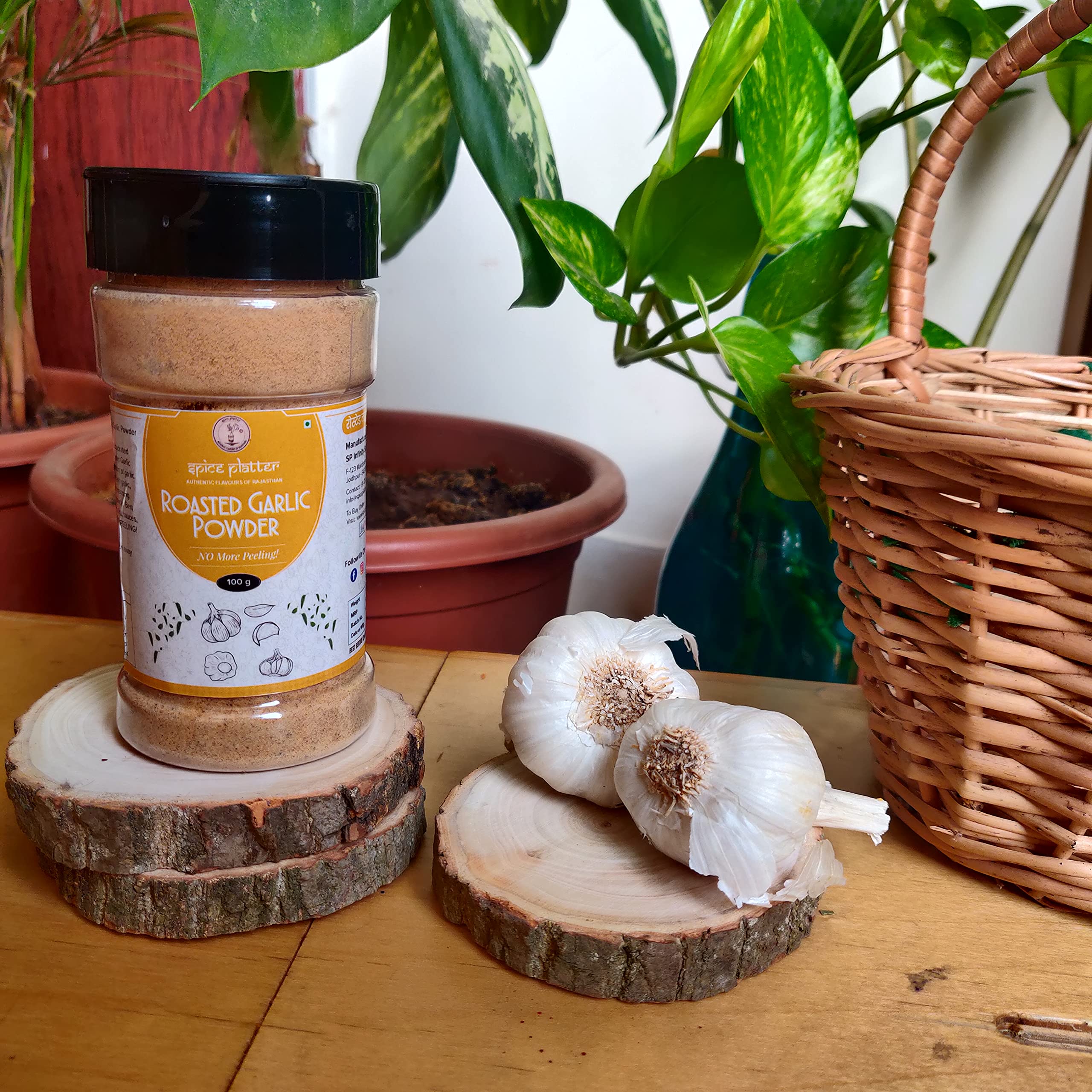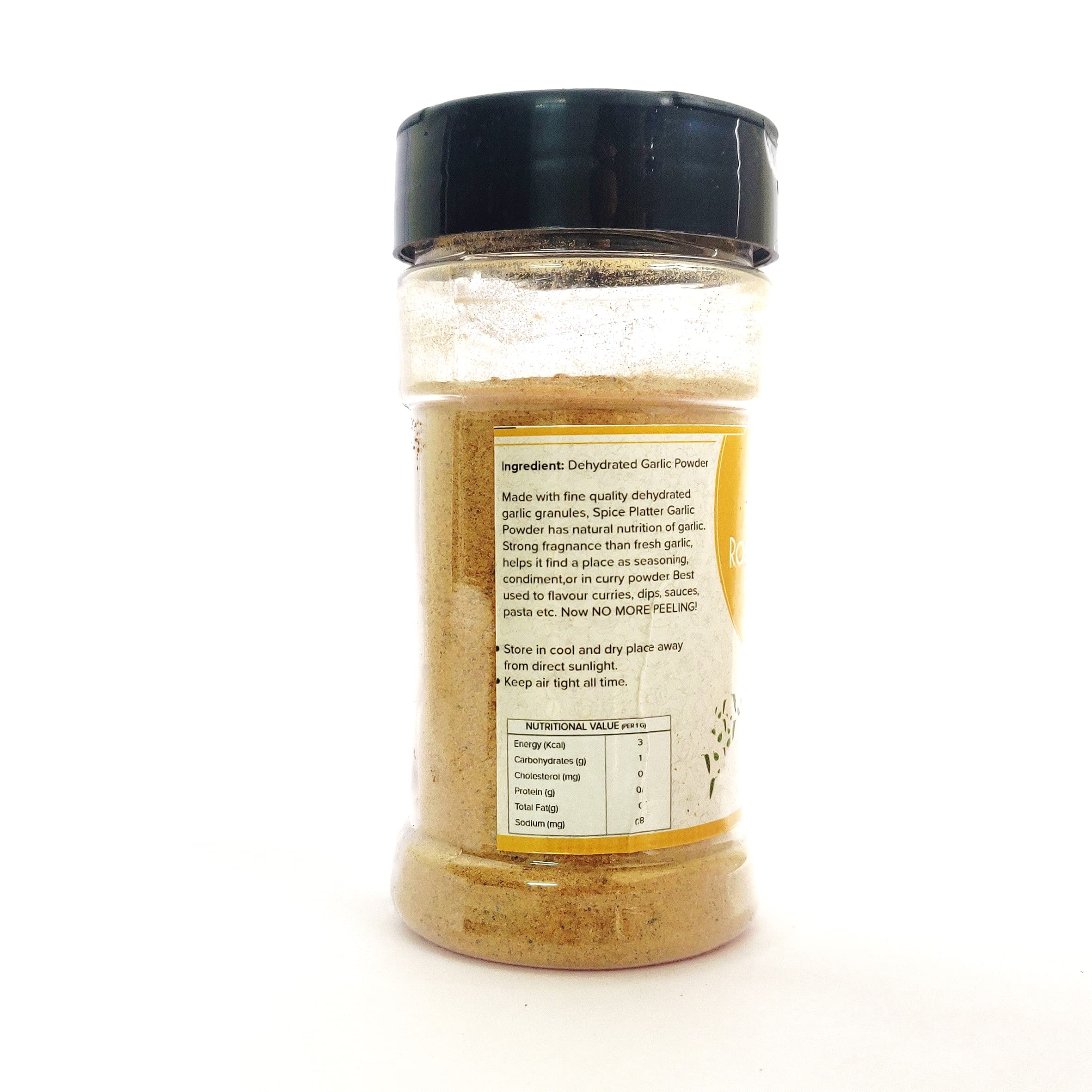 Having Roasted Garlic Powder in a kitchen cabinet can be very useful as it is a quick way to add lots of flavours to a dish. Spice Platter Roasted Garlic Powder is made by dehydrating roasting and grinding fresh & handpicked garlic cloves. Say Bye! to the hassle of peeling & chopping garlic cloves and substitute it with Spice Platter Garlic Powder! A quick way to add lots of flavours to any dish. Garlic Powder is more concentrated than fresh garlic cloves. Being Roasted it can be used as a seasoning on pizza pasta & sandwiches to add zing of garlic. No raw taste of garlic only convenient blast of flavours Ideal for flavouring to dishes in marinades and salad dressings