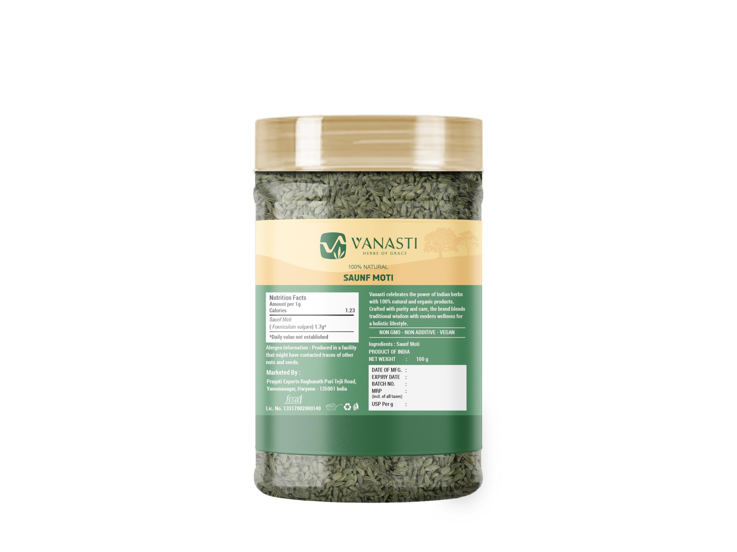 Saunf Moti, also known as Sonf Moti or Foeniculum vulgare, is widely used in cooking and garnishing. In Indian households, it's common to enjoy fennel seeds after meals. Fennel seeds are a natural source of key nutrients like copper, calcium, potassium, zinc, iron, and magnesium. They also contain trace elements such as selenium and manganese, along with vitamin C. Their refreshing flavor and nutrient profile make them a valued ingredient in both kitchens and traditional routines.