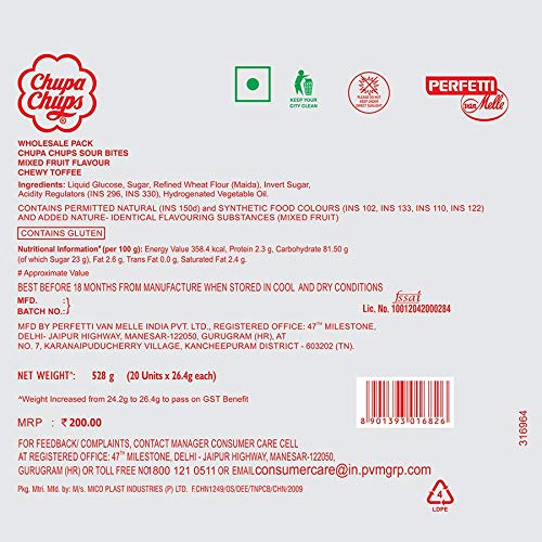 Chupa Chups Assorted Flavour Sour Bites Display Hanger 528 g (Count of 20)