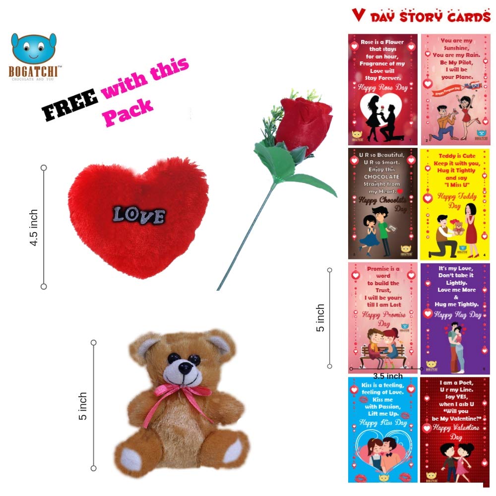 Bogatchi valentine's day gift combo- valentine chocolates with card valentine chocolates with teddy valentine chocolates gift hamper valentine gift for her valentine gift for him. Colour of the teddy soft toy (if shown) may change depending upon availability. Size of the teddy (if shown) is 5 inches (approx.). Size of fur heart (if shown) is 4.5 inches x 3.5 inches. Rose (if shown) is not natural. Size of card is 3 inches x 5 inches