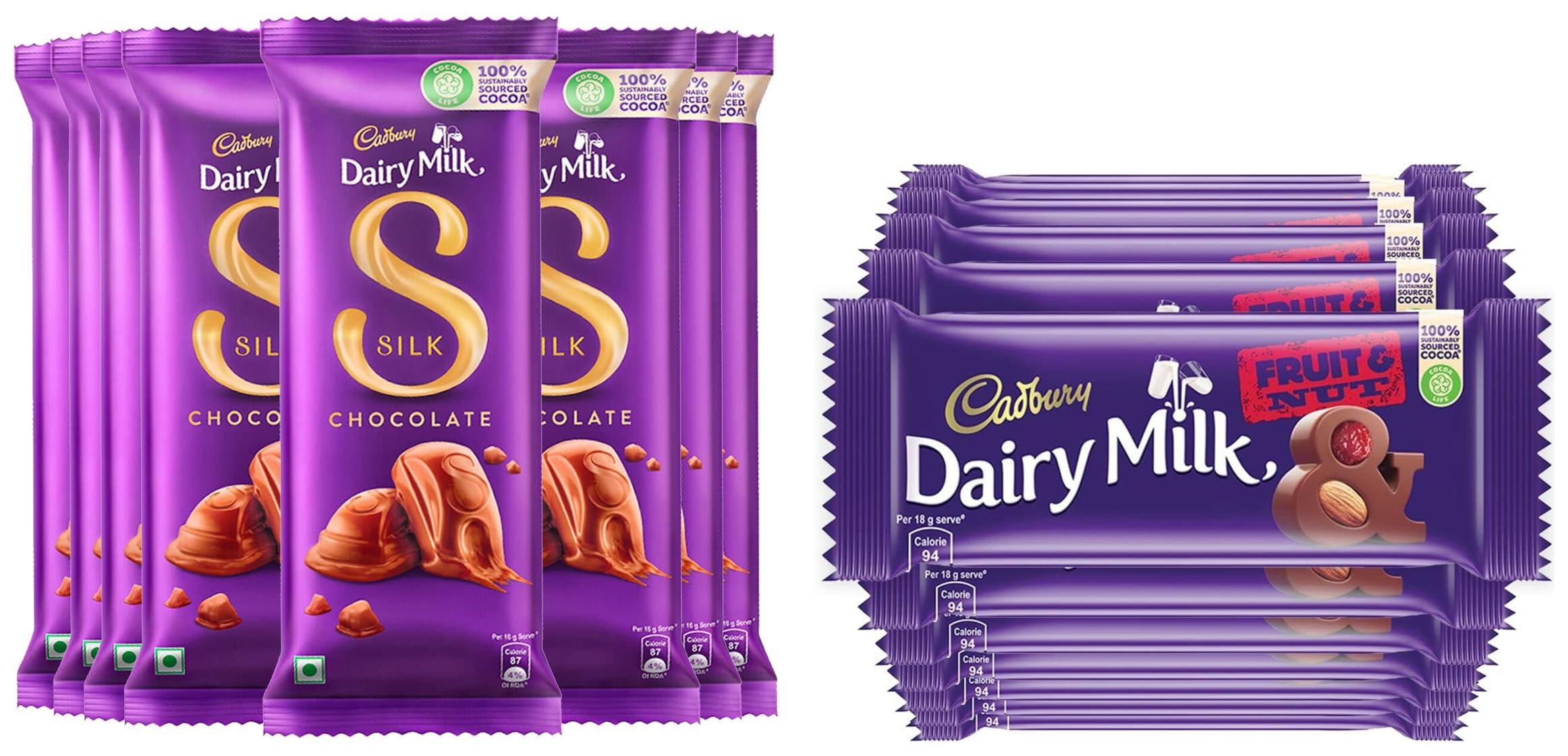 Cadbury Dairy Milk Silk Chocolate Bar 60g (Pack of 8)Cadbury Dairy Milk Silk is all about regaling in the chocolate's richness and creaminess. The classic taste of Cadbury chocolates offers you the reason to celebrate every small and big occasion of happiness. In short Indulge in the premium chocolate delicacy. This Pack Contains Cadbury Dairy Milk Silk Chocolate Bar 60g (Pack of 8).Cadbury Dairy Milk Fruit & Nut Chocolate Bar Pack of 12 x 36gKuch achha ho jaaye kuch meetha ho jaaye with Cadbury Dairy Milk. Generously made with a glass and half of milk Cadbury Dairy Milk also has raisins & nuts. Cadbury Dairy Milk is the perfect meetha for sharing everyday moments of joy with your loved ones. This pack includes 12 packs of 36g Cadbury Dairy Milk Fruit & Nut Chocolate. This pack of milk chocolate bars is perfect for snacking & storing in the fridge or for gifting & sharing on special occasions like birthdays and get-togethers. Every bar of Cadbury Dairy Milk is made from 100% sustainable cocoa. It is suitable for vegetarians.