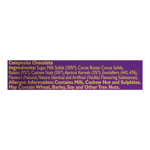 • adbury Dairy Milk Silk Fruit and Nut is made with a glass and a half of milk and offers a delicious combination of combination of creamy milk chocolate and almonds & raisins.