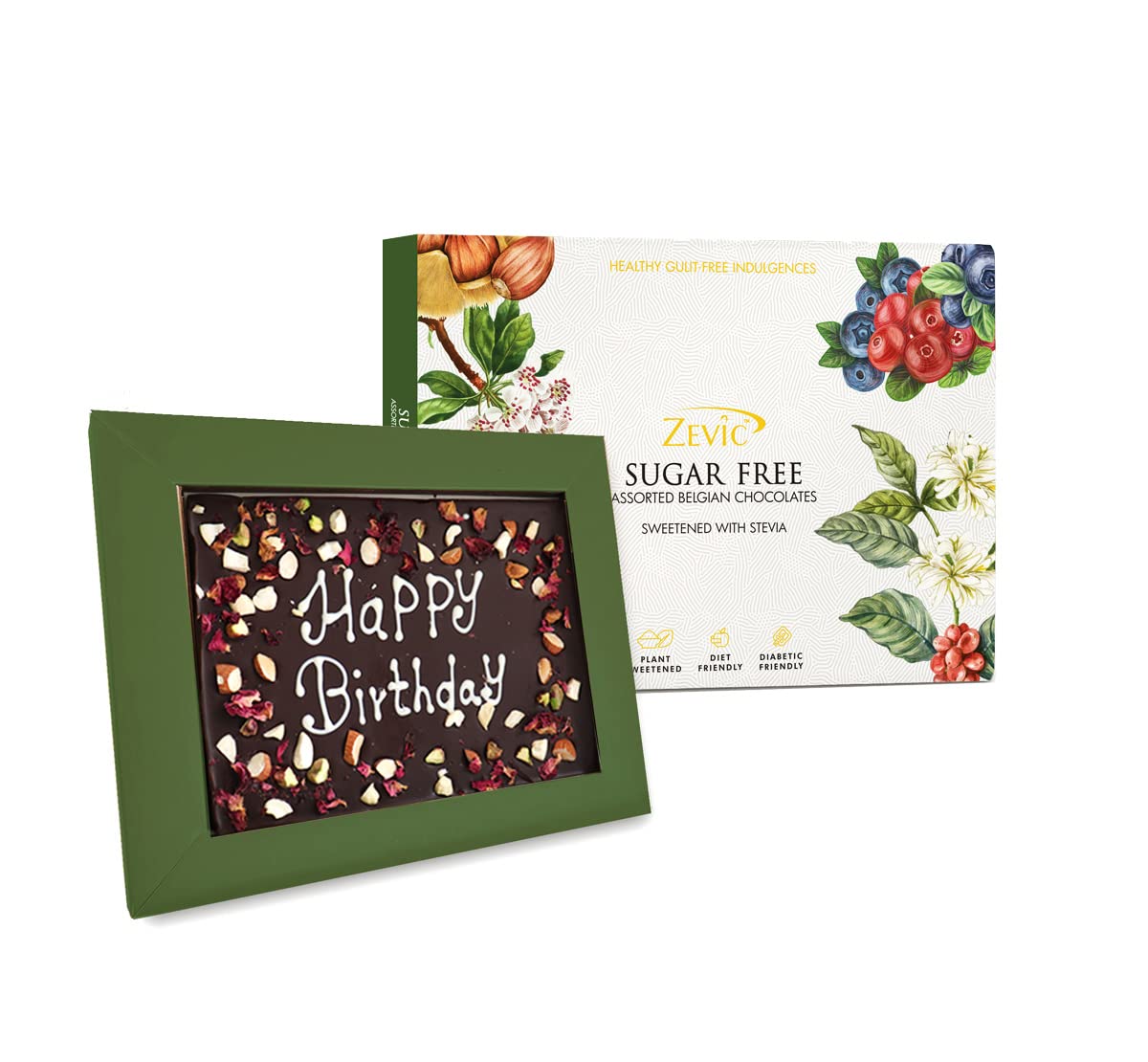 A perfect health gift for your loved ones Zevic health pack contains an assortment of 1 Zevic Sugar free Happy Birthday Bar Special Celebration Box - 120Gm gm Belgian chocolates with No added Sugar. Indulge in our absolutely guilt free divinity of rich cocoa made with select handpicked cocoa beans mildly enrobed with Naturally Zero Calorie sweetness of Stevia plant to give you & your loved ones the most luscious chocolate experience that'll leave your taste buds craving for more