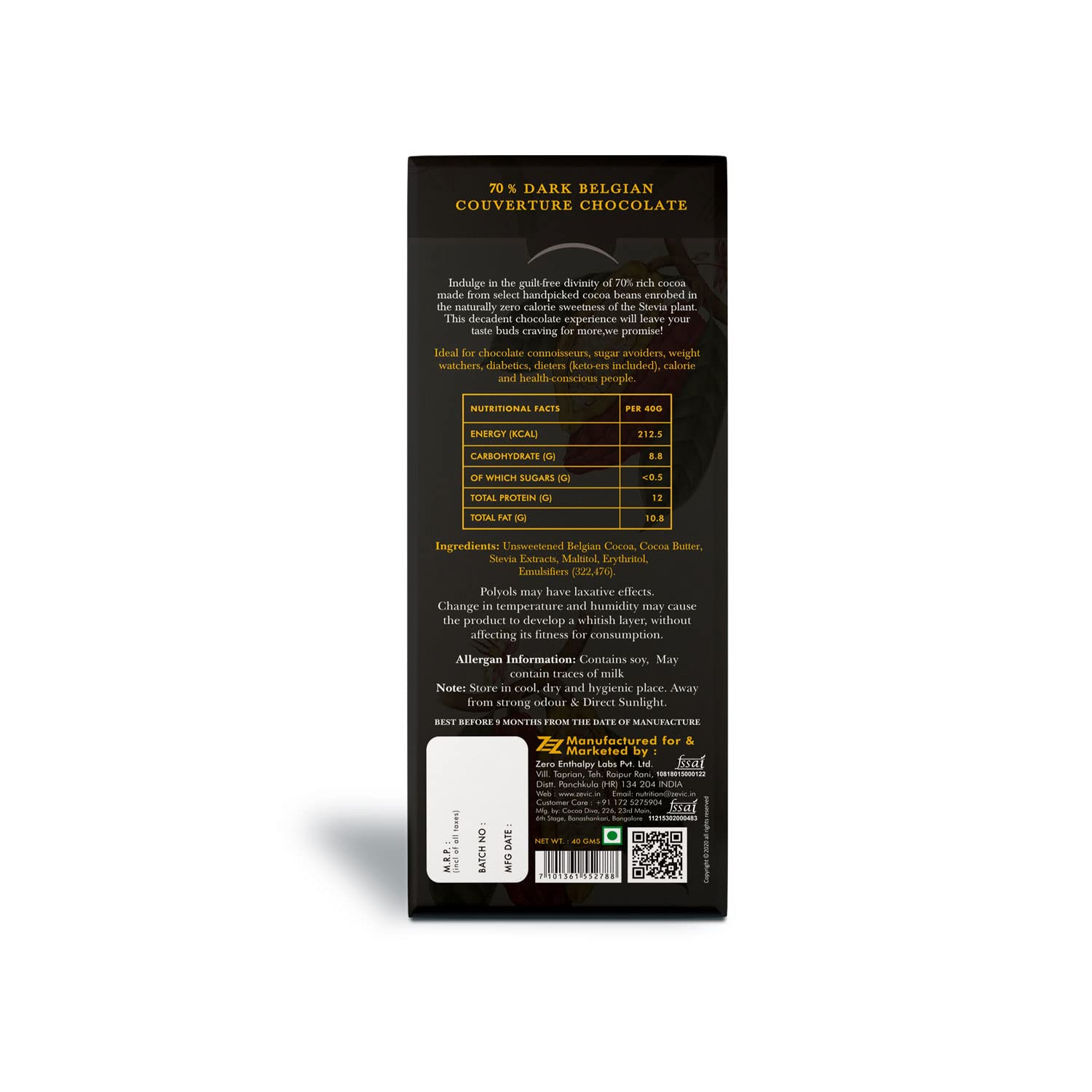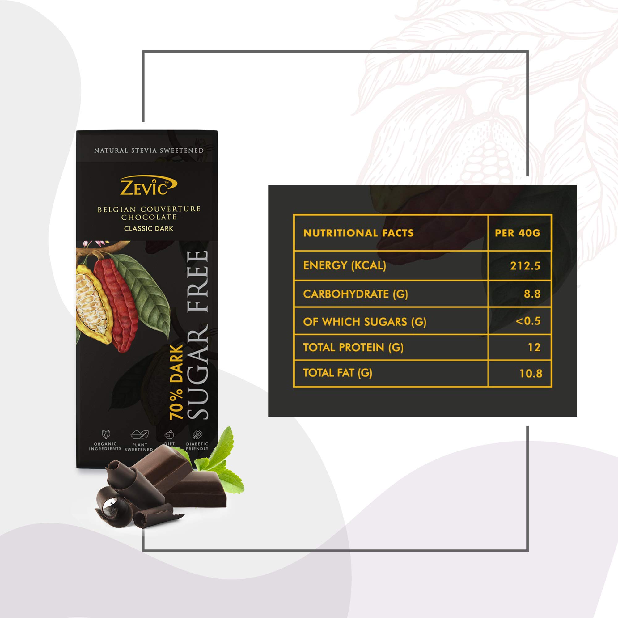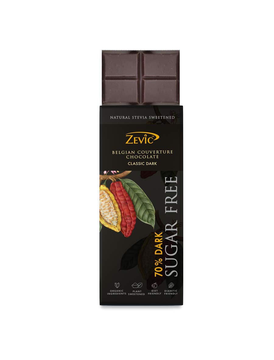 ZEVIC Sugar Free Chocolate with 70% Dark Chocolate | Classic Cocoa Belgian Dark Chocolate Bar | Natural Stevia Chocolate | Diabetic Chocolate | Keto Chocolate | Vegan Diet Healthy Chocolate 40g