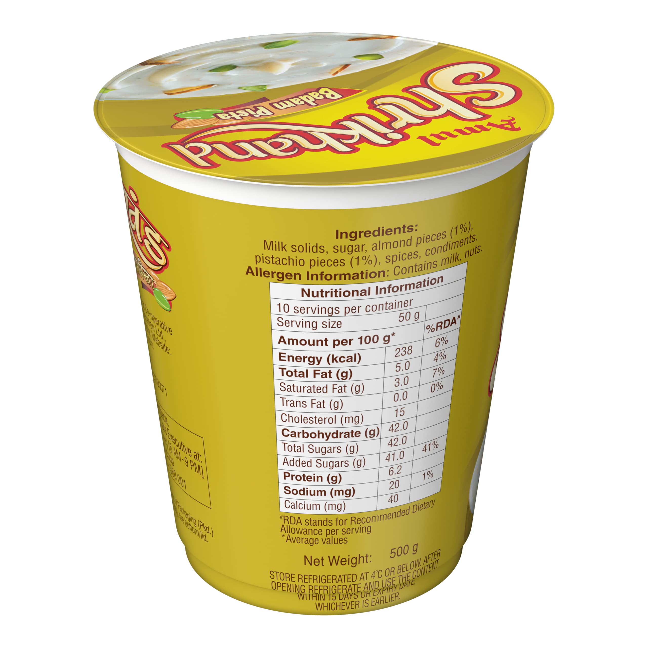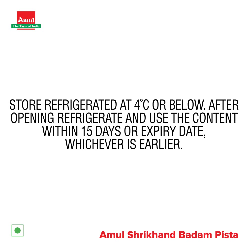 A delectable blend of sweet and sour offers you the finger licking taste enjoy the utmost taste of Amul Shrikhand Badam Pista Flavour. It is a whole milk product prepared from lactic fermented curd.