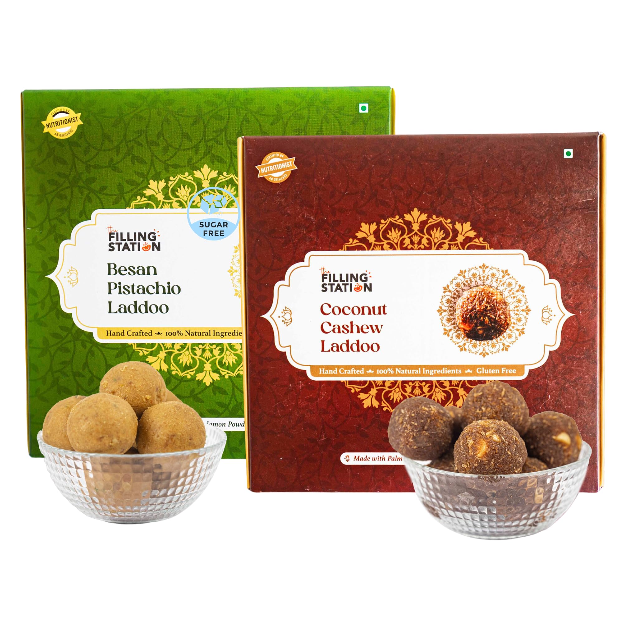 While thinking of sweets the first thing that comes to our mind is a laddoo. Besan Laddoos remind us of our old memories of daadi's/ grandma's lovingly filling our tiffin boxes with those laddoos for us our friends & family. Another Laddoo is the traditional “Narkel Naru'' i.e. Coconut laddoo or nariyal Laddu that has been part of every Bengali household celebrating various puja like Durga Puja Laxmi Puja Bhai dhuj etc. Now you no longer have to wait to indulge in these mouth-watering laddoos for the puja to come The Filling Station brings to you the traditional Indian Mithai/ sweet Narkel Naru i.e. laddoos with fresh coconut cashew nut and sweetened with Palm Jaggery so that you can have a bite whenever you want. The Filling Station based out of Mumbai offers Besan Pistachio Laddoo that has Besan(Gram) Flour which is high in protein and are gluten free and coconut cashew Laddoo that has coconut which is high infiber. We usually have sweets after our meals and you can have these laddoos as they are helpful in digestion. Nuts are added to the laddoo for extra flavour and taste. Here fresh dry fruit - Pistachio is added for protein and energy. You can make these Besan & Coconutn Laddoos in festive seasons and during functions. Besan laddoo is prepared by roasting gram flour in ghee slowly. When it turns golden brown colour it is removed from heat & cooled. Palm jaggery and pistachio is then added to this mix along with cardamom powder and rolled into round ball. Coconut laddoo is prepared by roasting crushed coconut flesh in ghee slowly. When it turns light brown colour Palm jaggery is added to it and roasted further. Once the moisture contain reduces the mixture is allowed to cool down a little. Cashew nut is then added to it and hand-rolled into round ball. The best thing is You can buy these sugar-free laddoo packet/box online and can offer these premium laddoos as gift to your friends colleagues and family members for any occasion as symbol of y