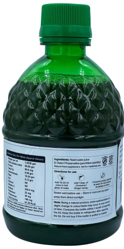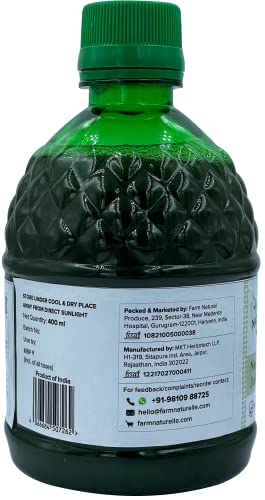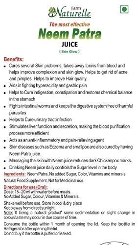 Neem Juice has several health benefits. Since Neem is beneficial for the body skin and hair the Farm Natural Neem Patra Juice cleans blood to take care of Pimples and Acne. It increases Blood Flow through subcutaneous skin thus helps in improving Skin Texture reduction in wrinkles and increase in immunity. The toxins from the system are flushed out which helps in improving liver functioning and digestion. Drinking it daily controls the Sugar level in the body. Massaging the skin with Neem juice reduces dark marks on skin. For added benefits have Herbal Lemon Tea Skin Glow and 5 fruit MOP Tea and also use Aloevera and Amla juice. Vitamin C and Aloevera gives added benefits.