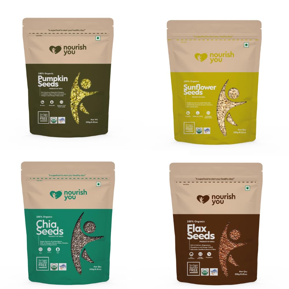 Nourish You Healthy Seeds Combo 1kg | Jumbo Pumpkin Jumbo Sunflower Flax Seeds Chia Seeds (250g Each Pack) | Seeds for Eating | Immunity Booster Diet | Protein and Rich in Fibre
