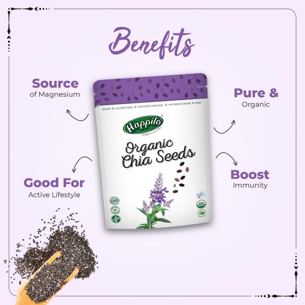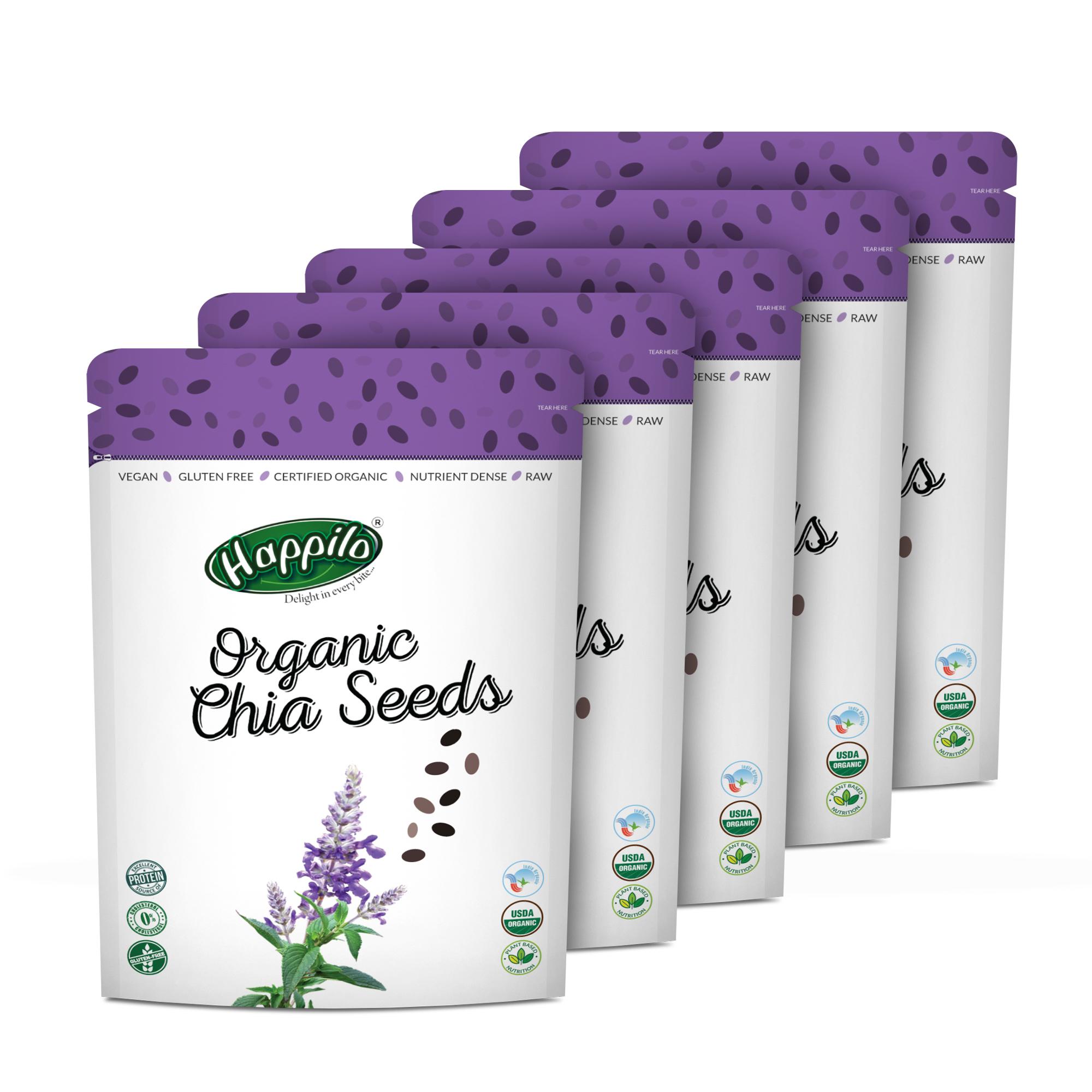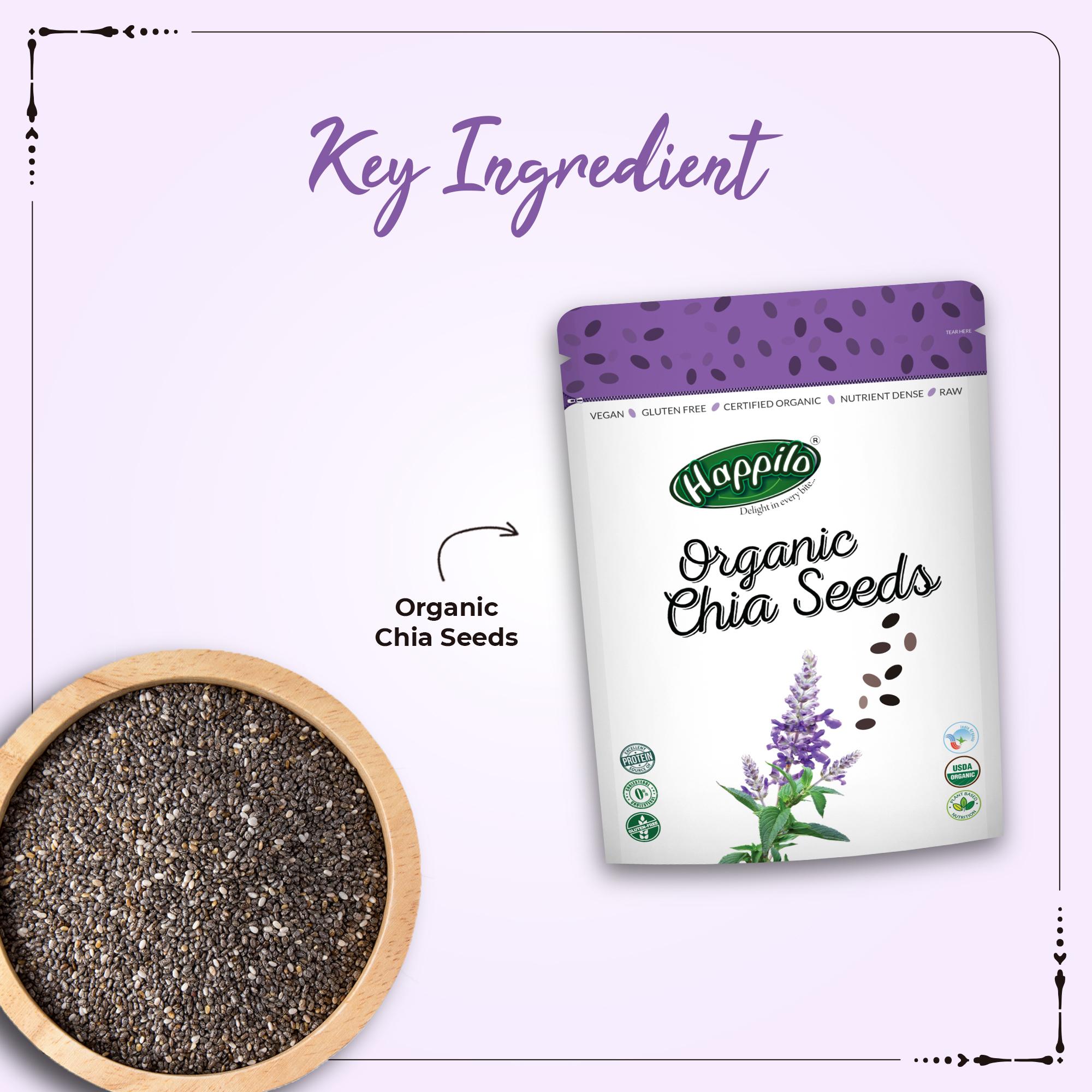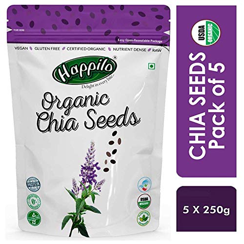 A traditionally native to South America Organic non-GMO Premium Chia Seeds pack a powerful superfood punch. These small crunchy gluten-free seeds are a rich source of protein beneficial antioxidants essential omega-3 fatty acids and wholesome fibre. A Brand that is committed to improving the quality of your life Happilo provides food that is packed with the goodness of nature and taste that will keep you wanting for more. With a range of food items across categories like Dry fruits Nuts Seeds Berries Nut Mixes and other healthy items each of our products is not only 100% Natural but is also made of 100% Whole Grains. While we stand strongly for Health wherein our products have a clear functional benefit we believe that Taste is the most important element when it comes to Snacks. We strive to bring the best range of snacks to you. Healthy Snacking with Happilo Premium Dry Fruits Nuts Seeds Berries & Nut mixes.