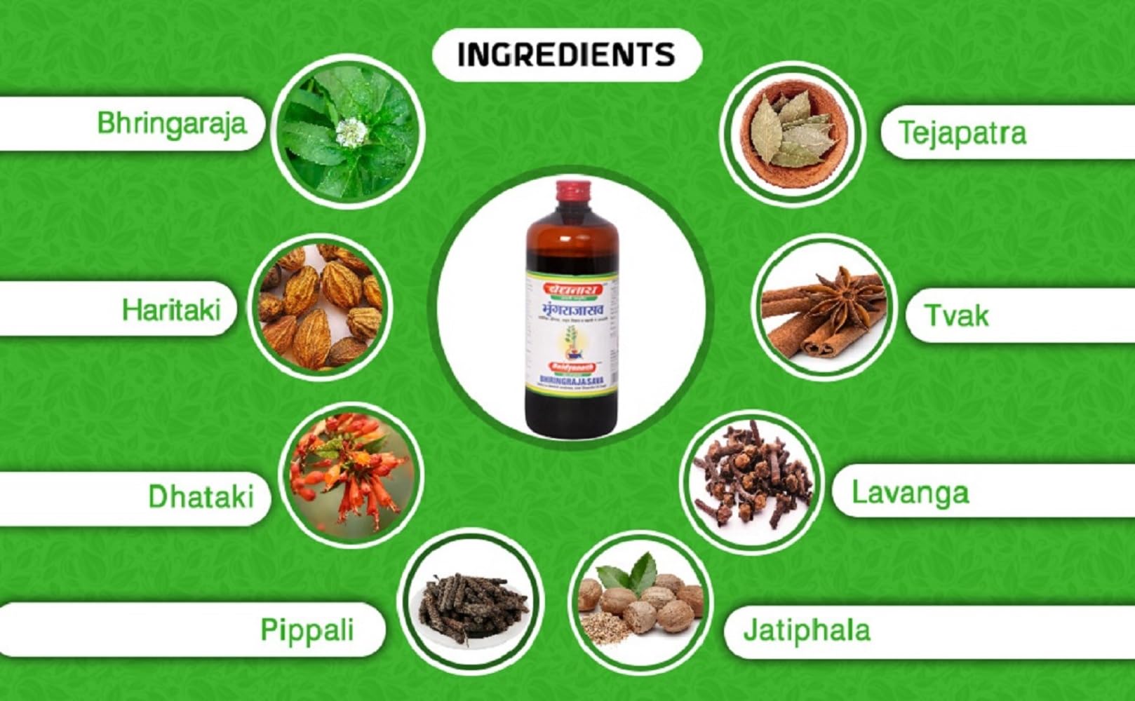 Bhringrajasava is a polyherbal Ayurvedic medicine containing Bhringraj Ras (Eclipta alba) Chaturjaat Haritaki Pippali Jatiphala and Jaggery. Chaturjat Churna is formed by mixing of Dalchini (bark Cinamonum zeylanicum) Ela (seeds of Elletaria cardamomum) Tejpatta (leaves of Cinnamomum tamala) and Nagkesar (flowers of Mesua ferrea). Traditionally Chaturjat is prescribed for improving appetite promoting digestion curing hepatic and renal disorders. It is Ruksha Tikshna Laghu and Ushna Veerya