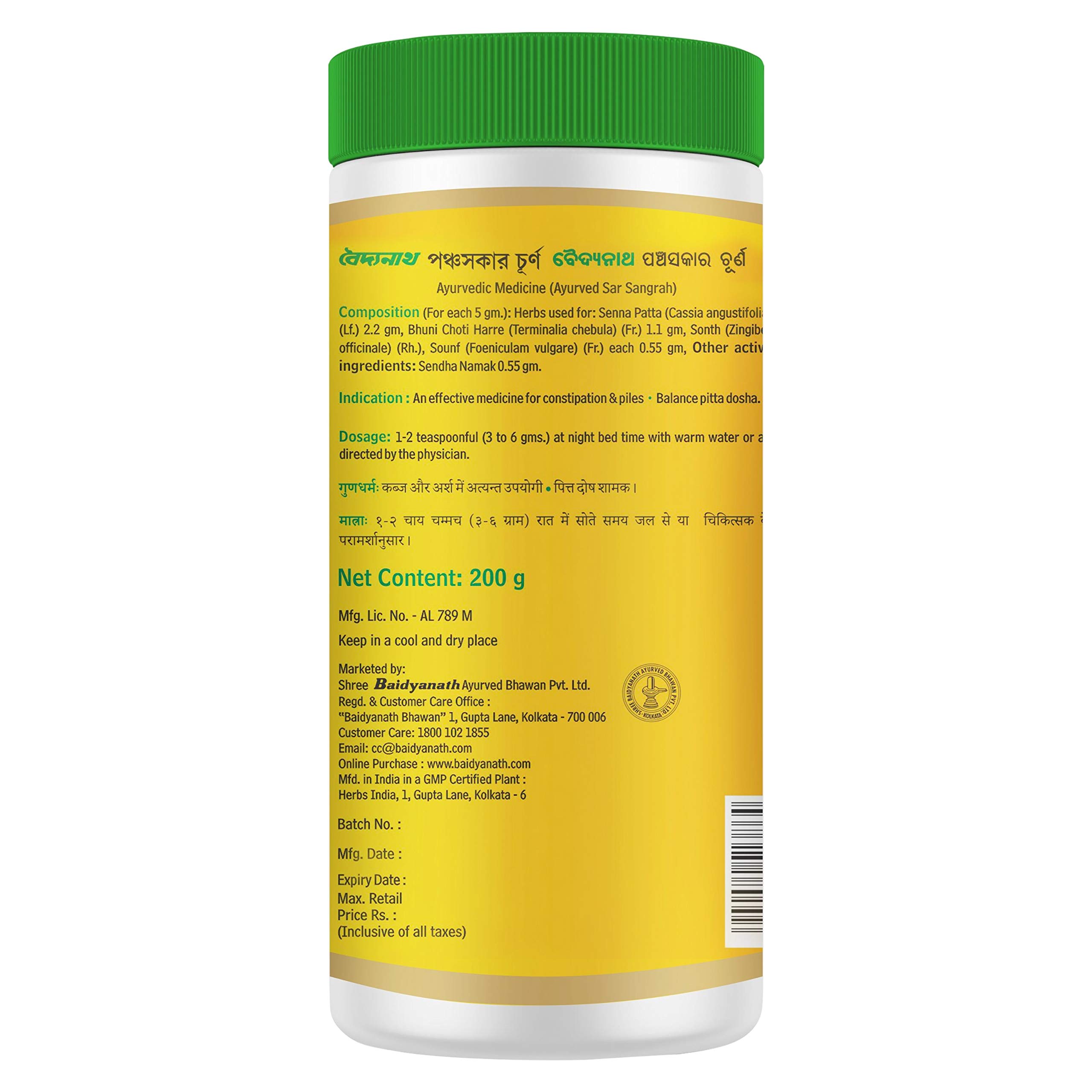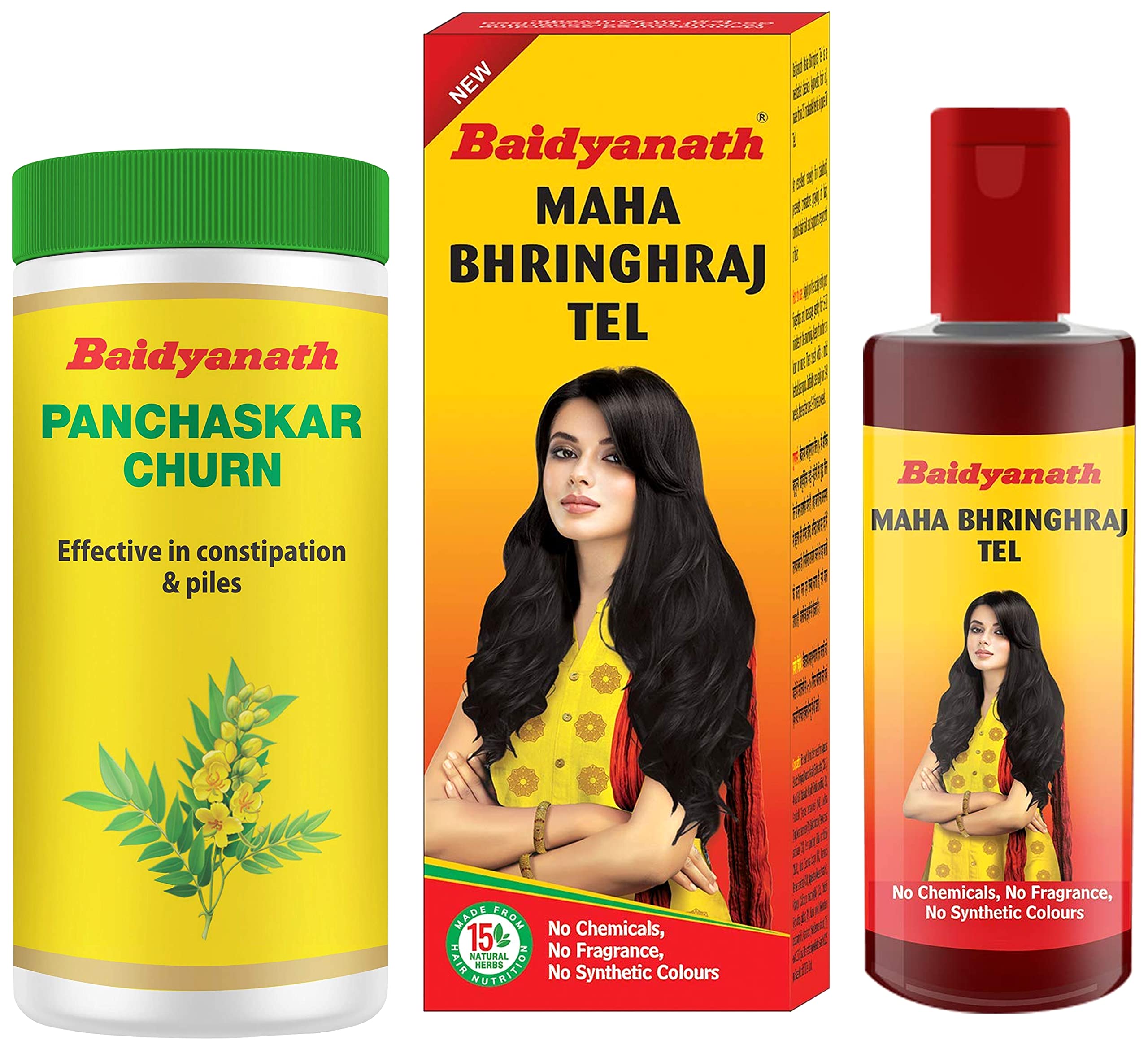 Baidyanath Mahabhringraj Tel (Original) | Hairfall Control | Ayurvedic Medicated Hair Oil | 4X More Effective | For All Hair Types (Male & Female) - 200mlBaidyanath Mahabhringraj Tel is considered really effective for promotoing overall hair health. Made up of best quality herbs Mahabhringraj tel not only helps the hair look shiny and lustrous but nourishes it from within. Mahabhringraj oil is also know to relieve pressure from the multiple pressure points present in the scalps. Mahabhringraj Oil considered best for advanced hair care contains hand plucked hair freindly ayurvedic herbs that prevent hair damage.Baidyanath Panchasakar Churna - 200 gBaidyanath Panchasakar Churna is an Ayurvedic herbal medicine that helps to treat haemorrhoids constipation and other abdominal ailments. Panchasakar Churna is made by mixing five ingredients in the same proportions. The five ingredients used to make this Ayurvedic recipe are Ginger Rock salt Myrobalan Fennel seeds and Senna leaves. These ingredients are well known for managing indigestion constipation loss of appetite accumulation of toxins in the body and other health problems caused by indigestion.