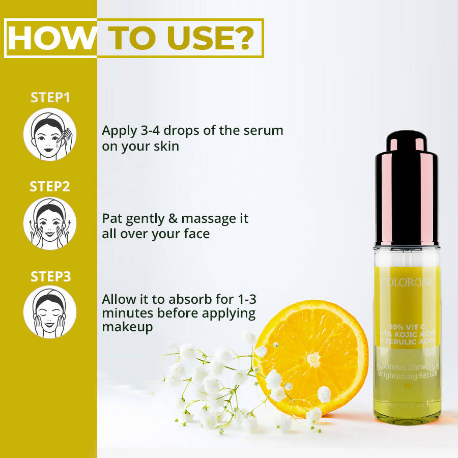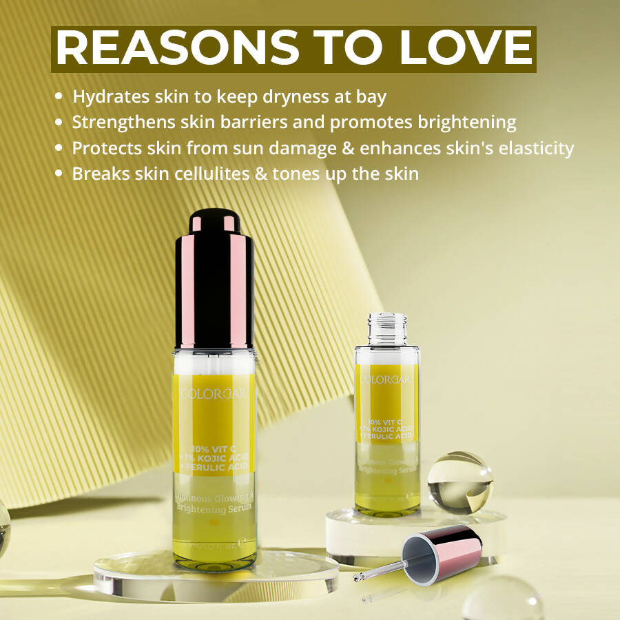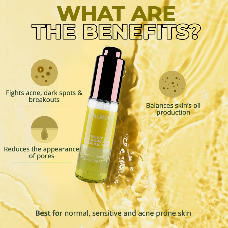 Colorbar Serum 10%Vit C + 1% Kojic Acid + Ferulic AcidAbout the product:This antioxidant rich face serum is infused with the goodness of powerful ingredients that help brighten the skin, boost collagen and reveal a glowing luminous skin.The serum is formulated to make skin glow by correcting photo damage and enhancing collagen, improved skin texture, fine lines and wrinkles.It strengthens skin barrier as well as promotes skin brightening.Legal Disclaimer: Product images are for illustrative purposes only. Images/packaging/ labels may vary from time to time due to changes made by the manufacturer's manufacturing batch and