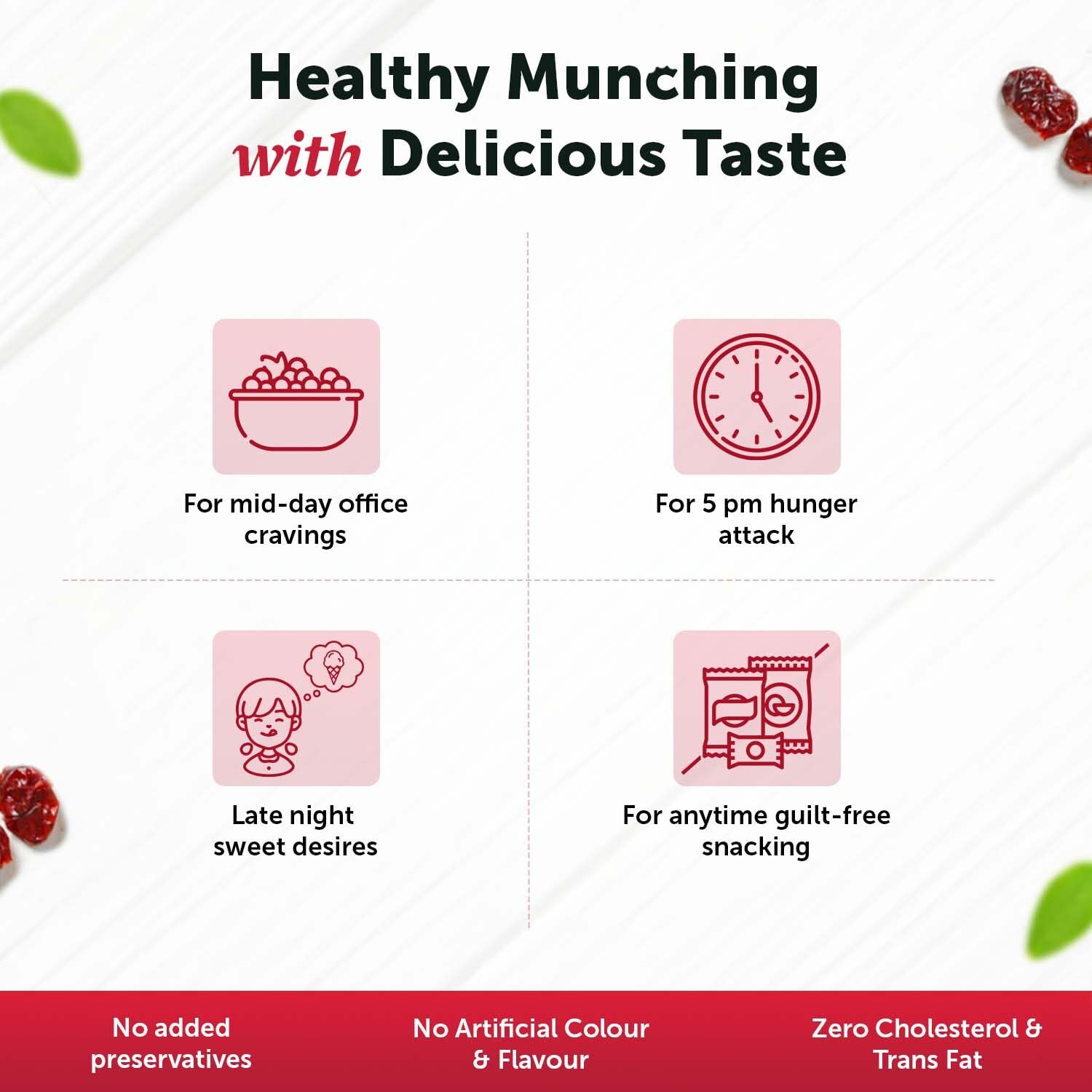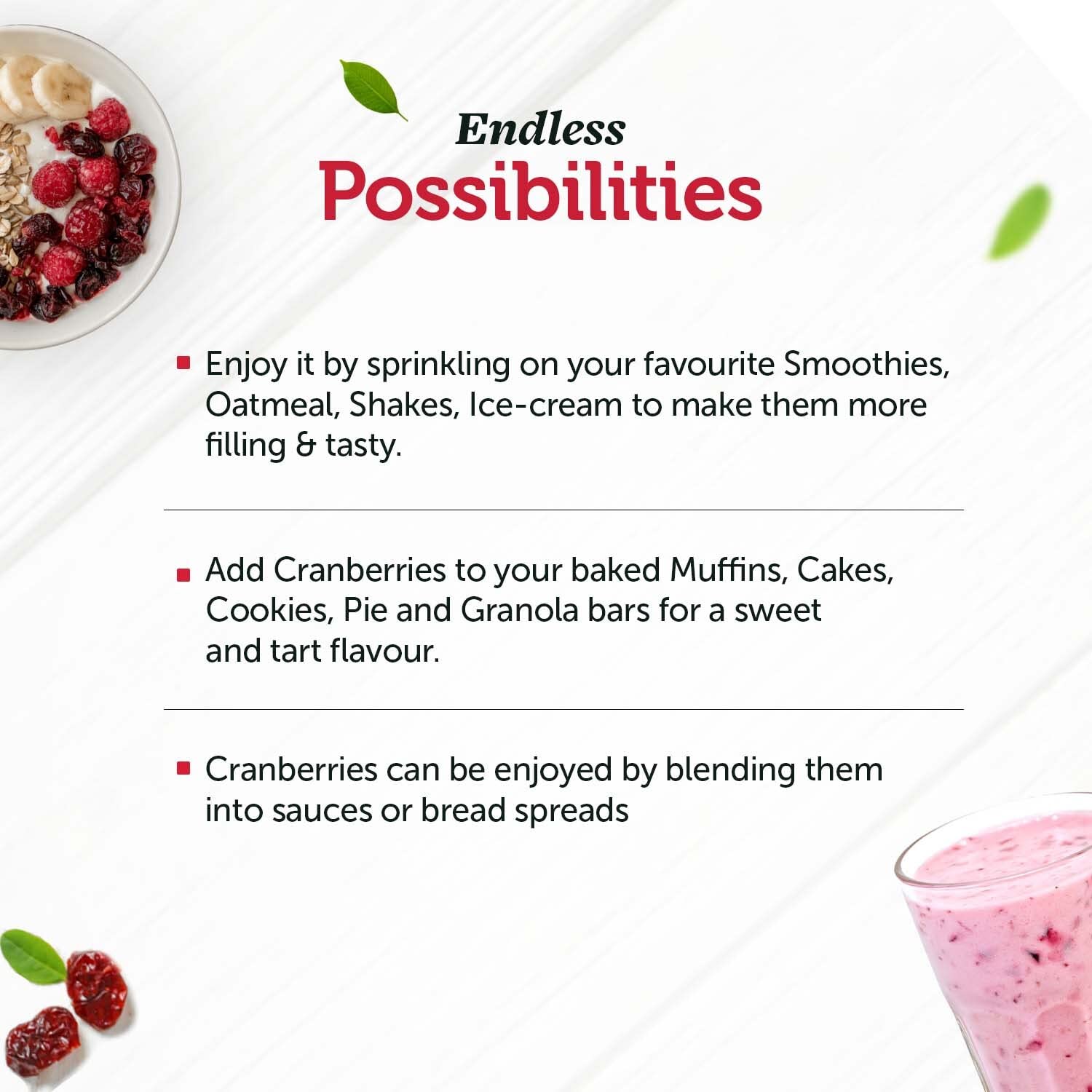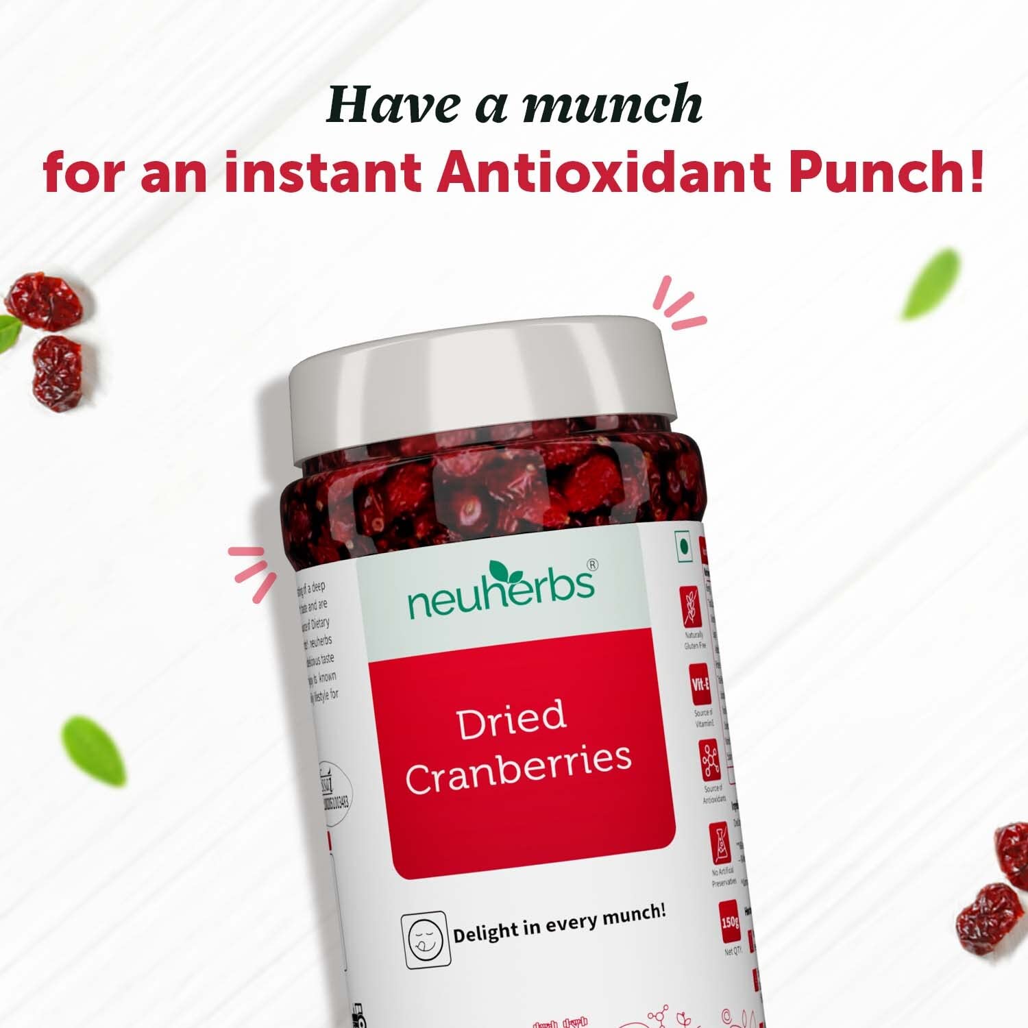 Cranberries are loved & used by many due to their unique sweet & tangy taste. Cranberries are high in Antioxidants which gives them an attractive natural deep red colour. Also they are known to be a source of Vitamin E and are naturally free from cholesterol these benefits of cranberries make them an incredible option for excellent immunity a healthy heart & skin. neuherbs brings to you the goodness of dried cranberries with no artificial preservatives to offer you an authentic delightful taste of dried cranberries that is free of bad stuff. Incorporating dried cranberries in your daily homemade recipes can impart a delicious taste & nutrition.