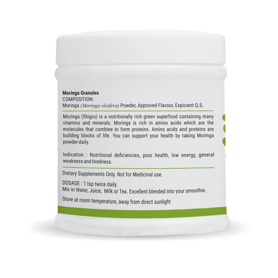 Moringa (Shigru) is a nutritionally rich green superfood containing many vitamins and miner. Moringa is rich in Amino acids which are the molecules that combine to form proteins. Amino acids and proteins are building blocks of life. You can support your health by taking Moringa Granules daily.