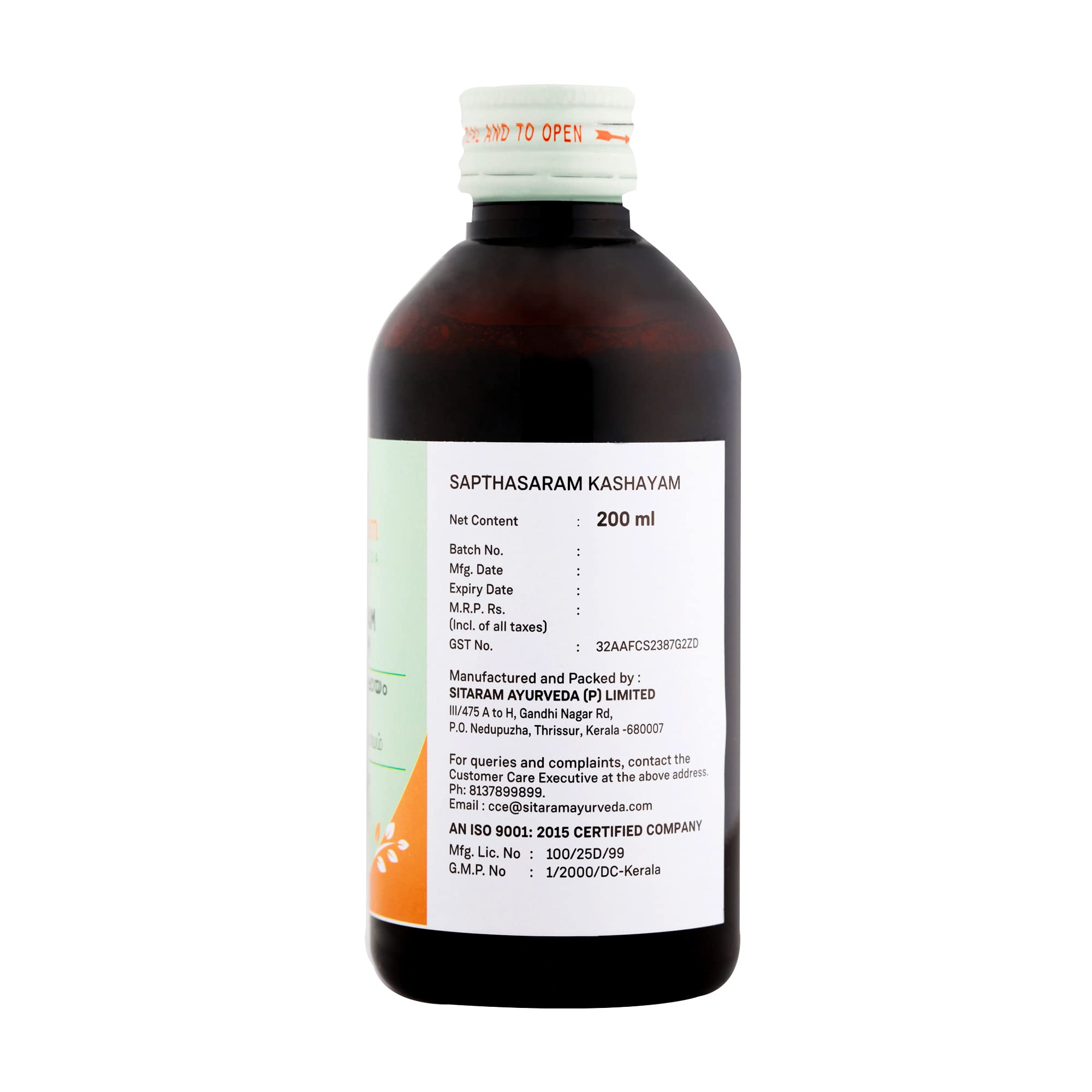 Punarnava Vilwa and Kulatha are the ingredients of this versatile combination that effectively or soola. Sapthsara kashaya has distinct action and enables smooth functioning of the Apana. This decoction along with different adjuvants is widely used in managing female problems of varied origin. Kashaya or herbal decoctions harness the healing properties of herbs and roots in a mild and easily absorbable water base.
