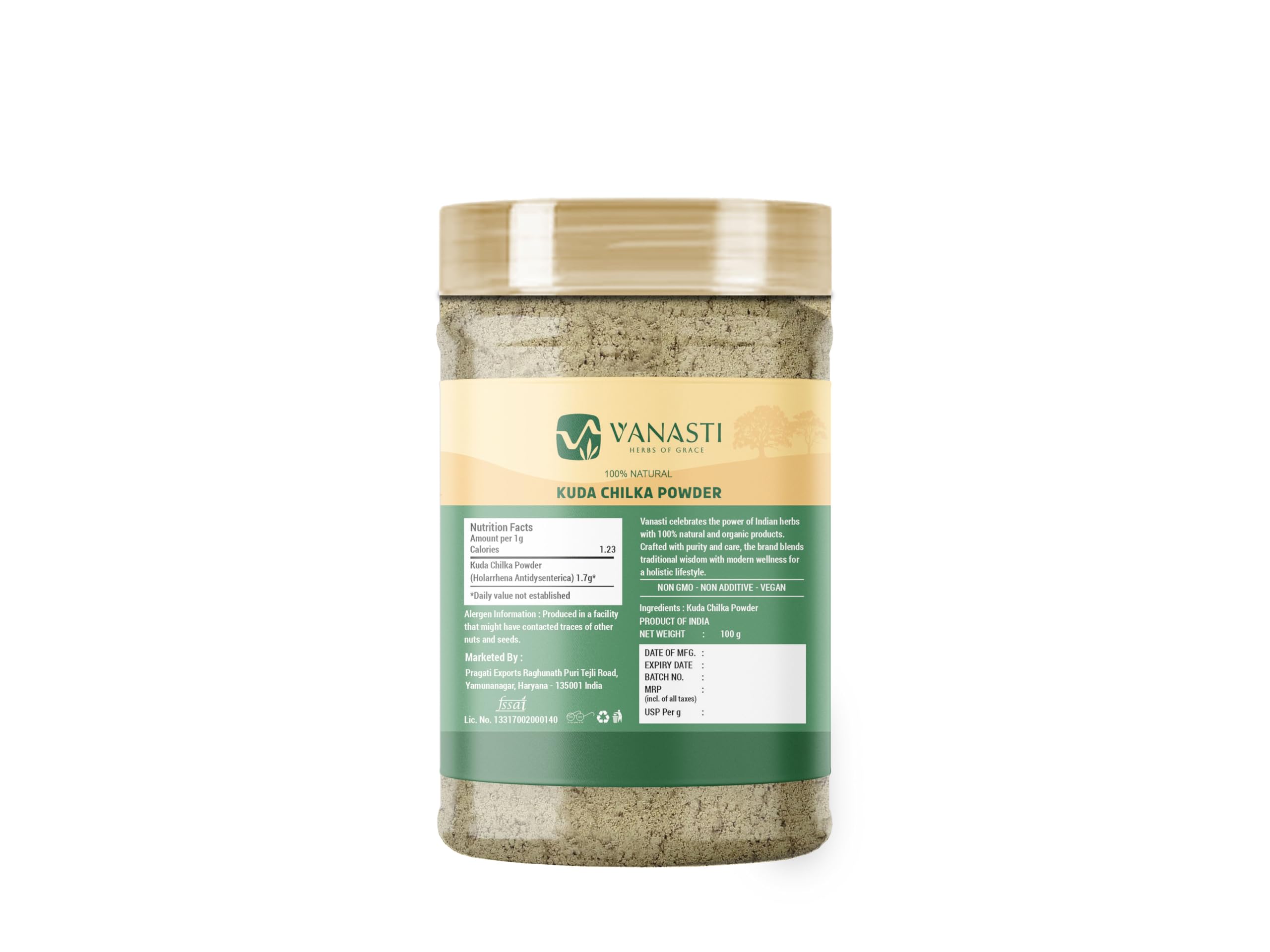 Kuda Chilka Powder, also known as Kutaj (Holarrhena antidysenterica), is made from the dried bark of the Holarrhena tree.The powder is fine and light brown, with a mild earthy aroma and woody texture.This tree is native to India and commonly found in dry, deciduous forests.The powder contains dietary fiber and small amounts of calcium and potassium.It is occasionally used in herbal mixtures and select dry formulations.Kuda Chilka Powder is valued for its natural origin and clean, neutral taste.
