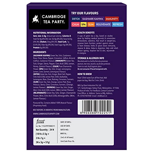 Cambridge Tea Party Mix Assorted Tea Sampler Pack 36 Tea Bags Cleanse Pure Light Green Spa Lemon Lime Lemongrass Calm Chamomile Detox Kahwa Slim Orange Refresh Tulsi Mint 6 tea bags each