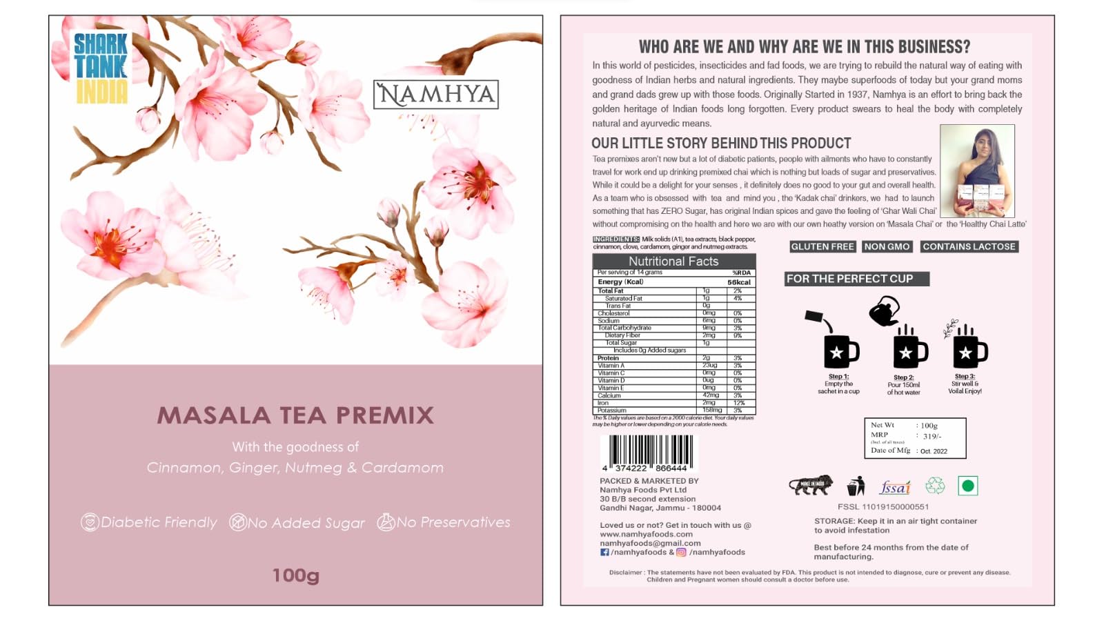 Experience the authentic flavors of Indian masala tea with Namhya Instant Masala Tea Premix! Indulge in a rich and aromatic cup of tea made from a perfect blend of premium tea extracts and a harmonious combination of Black Pepper Cinnamon Clove Cardamom and Ginger.Key Features:1. Authentic Indian Masala Tea: Namhya brings you the true essence of Indian masala tea carefully crafted to deliver an unforgettable tea-drinking experience.2. Easy to Prepare: Enjoy the convenience of our instant masala tea premix. Simply add hot water stir and savor the goodness within minutes.3. Premium Ingredients: We prioritize quality and flavor above all else. Our tea premix is made from the finest tea extracts and infused with a tantalizing mix of Black Pepper Cinnamon Clove Cardamom and Ginger.4. Gluten-Free and Non-GMO: We understand the importance of dietary preferences and health-conscious choices. This masala tea premix is gluten-free and free from genetically modified organisms.5. Aromatic and Invigorating: Each sip will take you on a sensory journey with the invigorating aroma and well-balanced blend of spices leaving a lasting impression.6. Perfect Anytime Beverage: Whether you want to kickstart your day take a refreshing break or unwind after a long day Namhya Instant Masala Tea Premix is the ideal beverage companion.7. Portable and Travel-Friendly: Each 100g pack is designed to be easily carried with you allowing you to enjoy a delightful cup of masala tea anywhere anytime.Savor the harmonious symphony of flavors in every cup of Namhya Instant Masala Tea Premix. Add it to your cart now and experience the magic of traditional Indian masala tea with a modern twist. Make tea-time truly special with Namhya!