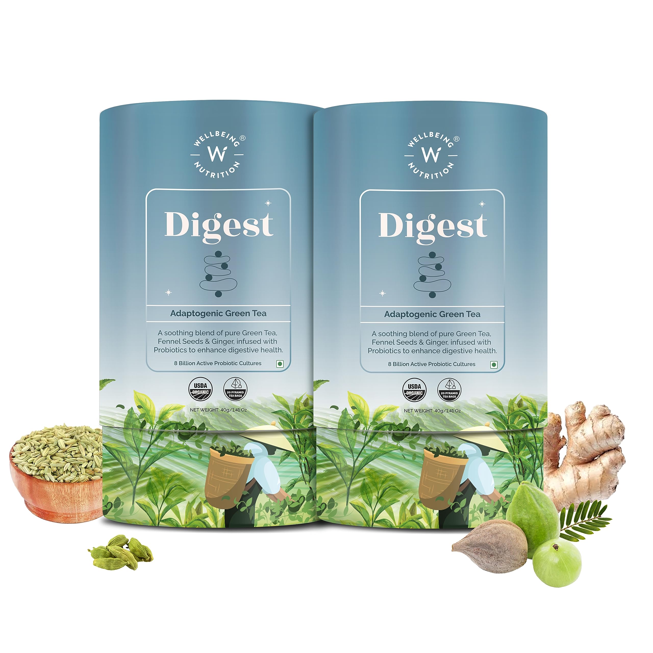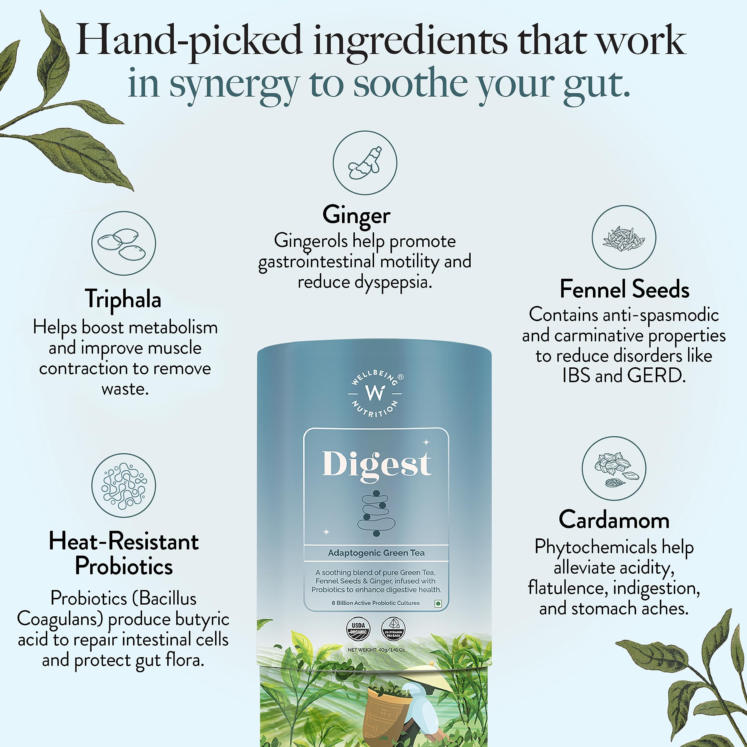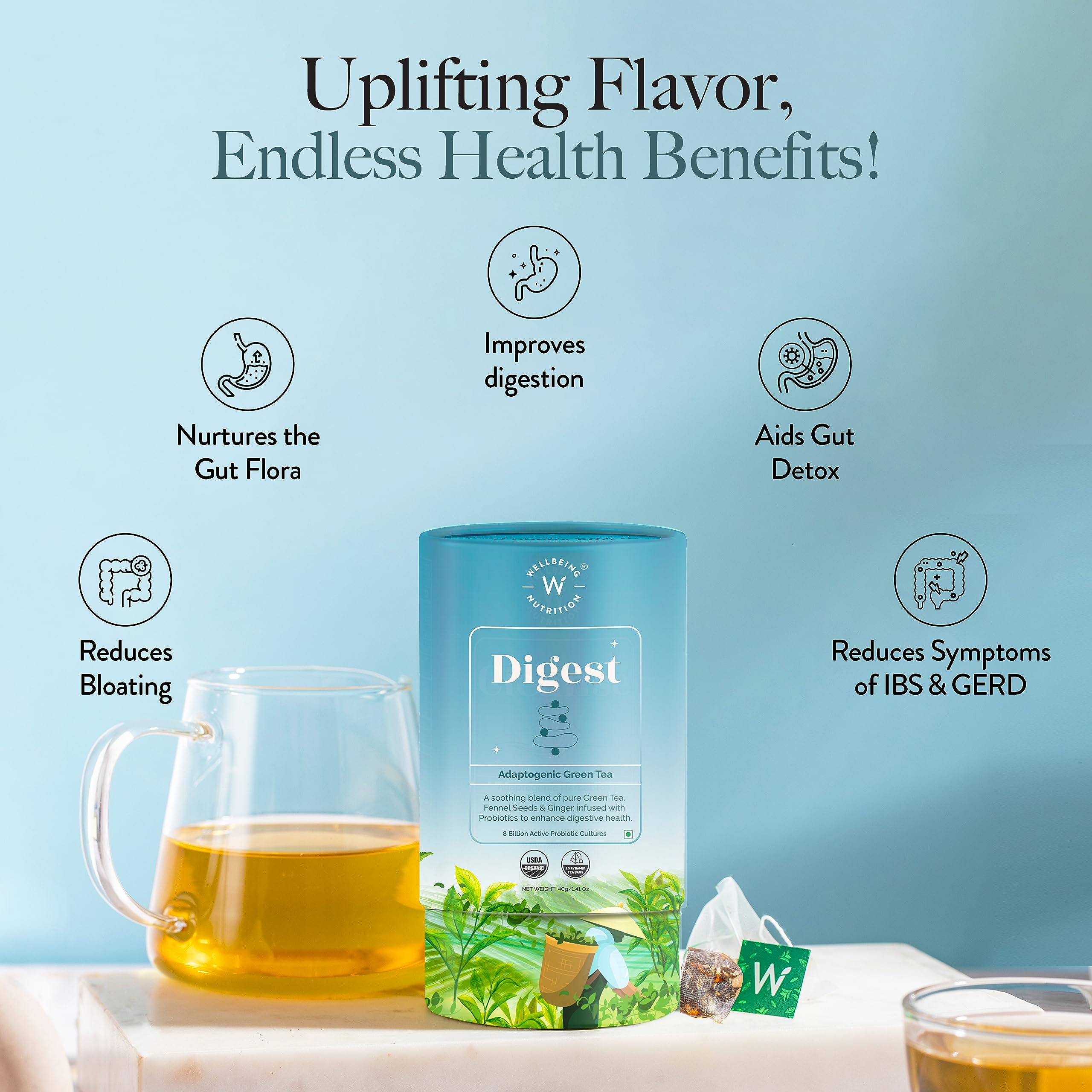 Wellbeing Nutrition Digest Green Tea | Digestive Tea with Probiotics Digestive Enzymes 8 Billion CFU & Fennel Seeds for better Digestion Bloating Gas and Acidity relief (40 Pyramid Tea Bags)