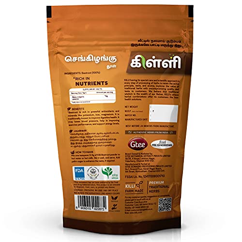 KILLI BEETROOT POWDERHEALTH BENEFITSBeetroot is rich in powerful antioxidants and minerals like potassium iron magnesium.HOW TO MAKEMix one teaspoon 3-5g of Killi Beetroot powder to hot water or hot milk. Stir it well and serve. Add palm sugar to enhance the taste if required.KILLI HERBS & SPICESKILLI having its special care and scientific approach in every stop of processing of herbs to retain the active principle taste and aroma explores the value of traditional herbs with uncompromising quality and taste to customers. We believe that the traditional wisdom is the wealth of our Nation. KILLI's unique herbal combinations offers its customers the best healthy solutions. KILLI is a Registered Trademark of Gtee