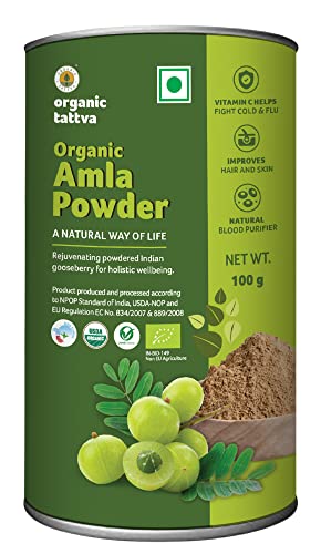Organic Tattva's Organic Amla Powder (India Gooseberry) is a great source of vitamin c calcium and Iron. Along with these Organic Amla Powder also contains dietary fibers potassium and various other nutrients. One teaspoon (2g) of Organic Amla Powder has 0g trans-fat and 0mg cholesterol. The calorie count per serving (2g) of Organic Amla Powder is 8. Switch to Organic Amla Powder by Organic Tattva for a healthier you. You must have heard this phrase before âBitter is betterâ. Isn't this what we have heard our grandparents say? Eat more bitter gourd kale sprouts and radishes as they are packed with abundant health benefits. Well have you heard of another such superfood Amla or Indian Gooseberry? Amla is a green colored translucent fruit which derives its name from the Sanskrit word âAmlaki' which means ânectar of lifeâ. Amla is famous in India for its many health benefits and its quality to handle countless ailments. As per Ayurveda amla can balance the three doshas in our body namely: Kapha Vata Pitta thereby eliminating the underlying cause of many health problems. It has eight times more vitamin C than an orange twice the antioxidant power of acai berry and around 17 times that of a pomegranate. The humble Indian gooseberry commonly known as amla truly deserves its superfood status. Being a very rich source of Vitamin C iron and calcium amla is a health treasure. It also offers a number of beauty benefits for your hair and skin. Amla is a very special fruit full of antioxidants that are effective in fighting with free radicals reason of cell damage. One of the best ways to have amla is in the powdered form. Since amla powder is a bit bitter tasting you can drink a mix of amla powder ginger powder honey and lime juice or you can even add amla powder to a glass of fresh juice for breakfast. You can also sprinkle some amla powder on fruits such as banana apple or papaya and have as a mid-meal snack.