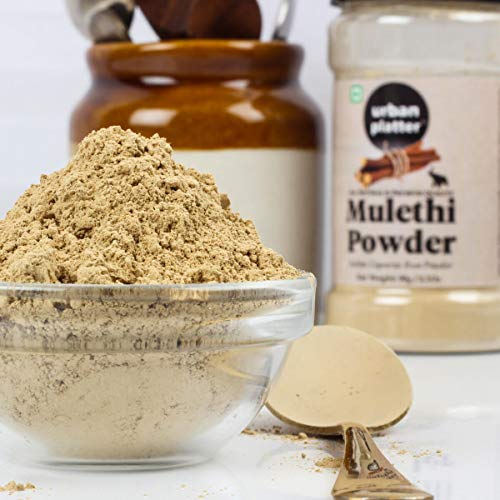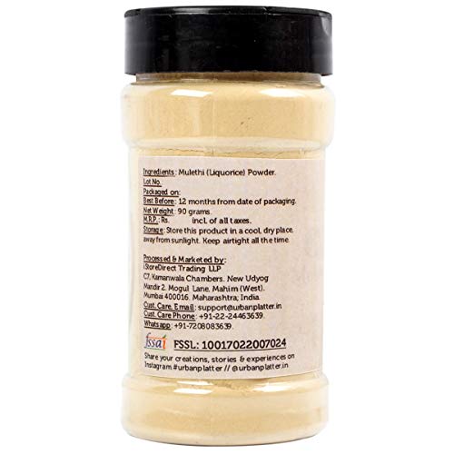 Mulethi Powder Shaker Jar 90g / 3.2oz [Indian Liquorice Roots Nourishing Energy Booster]Mulethi more commonly known as licorice is one of the prime herbs in Indian Ayurveda.Mulethi Powder is a good source of calcium glucose and iron. It helps to enhance adrenal function and increase energy level.Apart from medicines it is widely used as a flavoring agent due to natural sweetness.Add 1 tsp of licorice root powder to 8-10 Oz hot water and enjoy. Add a teaspoon of organic honey or a cinnamon stick to improve the taste and make the tea more palatable.