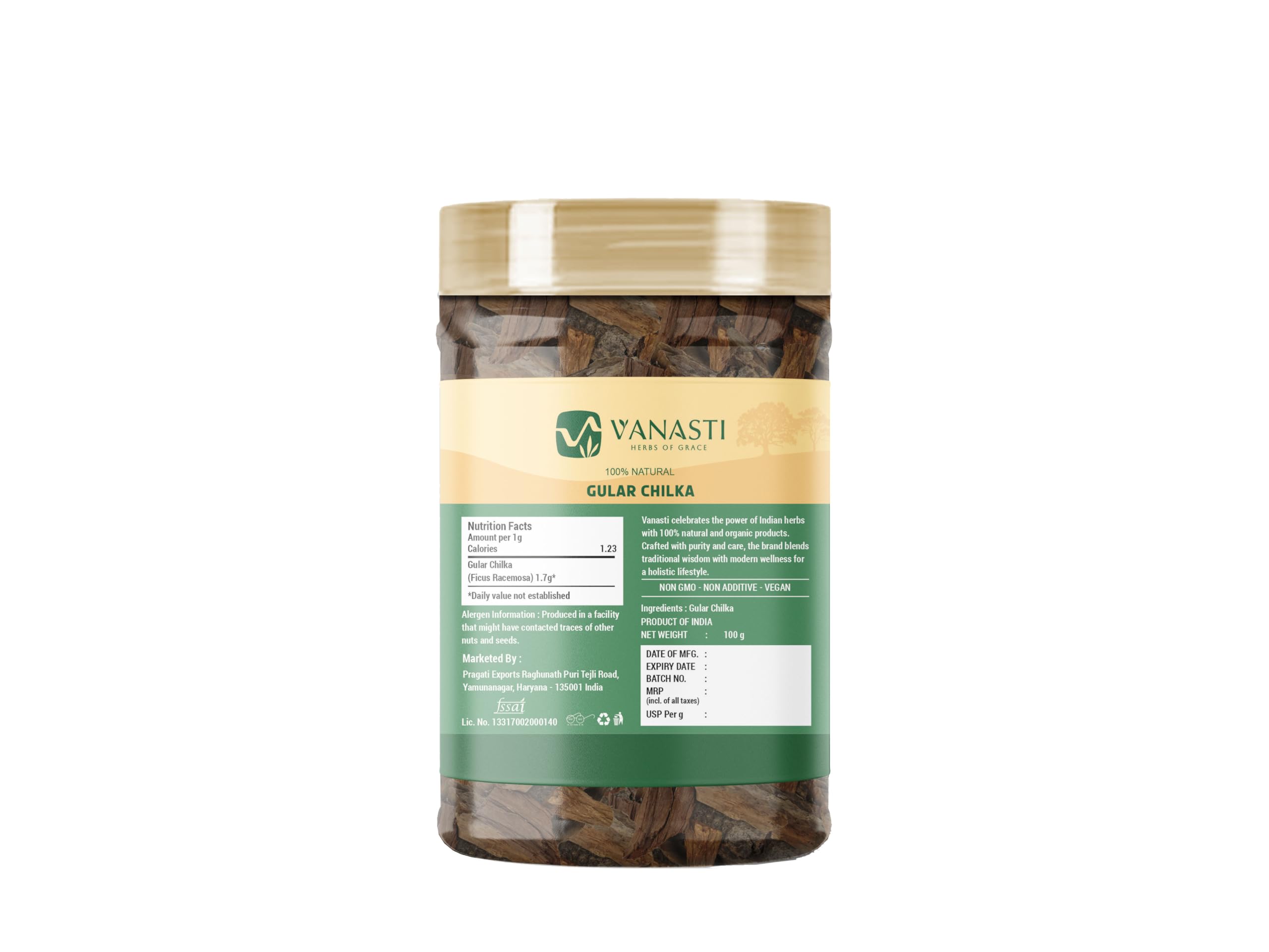 Gular Chilka (Ficus racemosa), also known as Goolar Chilka, is a deciduous tree native to South and Southeast Asia. Its reddish-gray bark, clustered fruits, and dark green leaves are well-known in traditional and cultural practices.Various parts of the treebark, fruit, and leaveshave been used in customary preparations and rituals. The fruits are added to regional dishes, while the bark and leaves are valued in local traditions. Gular Chilka contains natural plant compounds like tannins and flavonoids, contributing to its traditional significance.