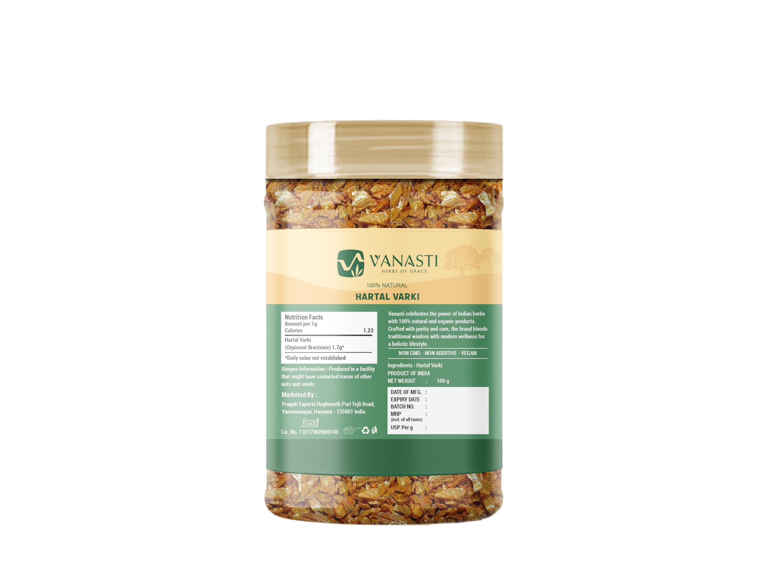 Hartal Varki (Yellow Orpiment) is a bright yellow mineral substance, often found in powder or flake form. It is prepared by purifying orpiment, a mineral containing arsenic sulfide. The powder has a fine texture and is sometimes used as an ingredient in specialized preparations. Due to its unique color and mineral content, Hartal Varki is handled with care and only used in very small amounts.
