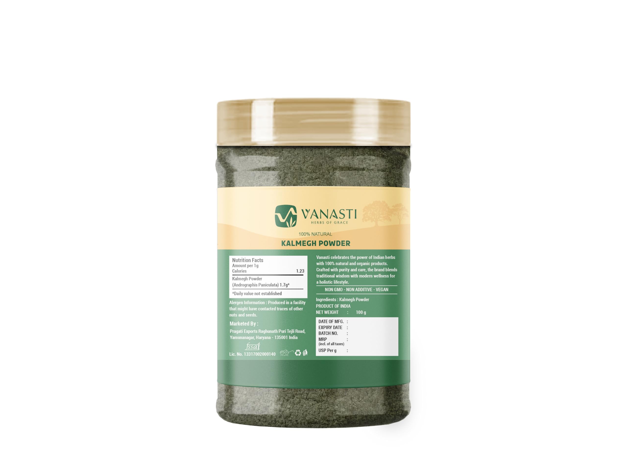 Kalmegh (Andrographis paniculata) is a leafy herb known for its intensely bitter taste and is native to South and Southeast Asia. The plant contains natural compounds such as andrographolide, neoandrographolide, and deoxyandrographolide. Kalmegh is low in calories and provides small amounts of dietary fiber and plant-based antioxidants. It is often used in botanical preparations and as a bittering agent in various culinary applications.