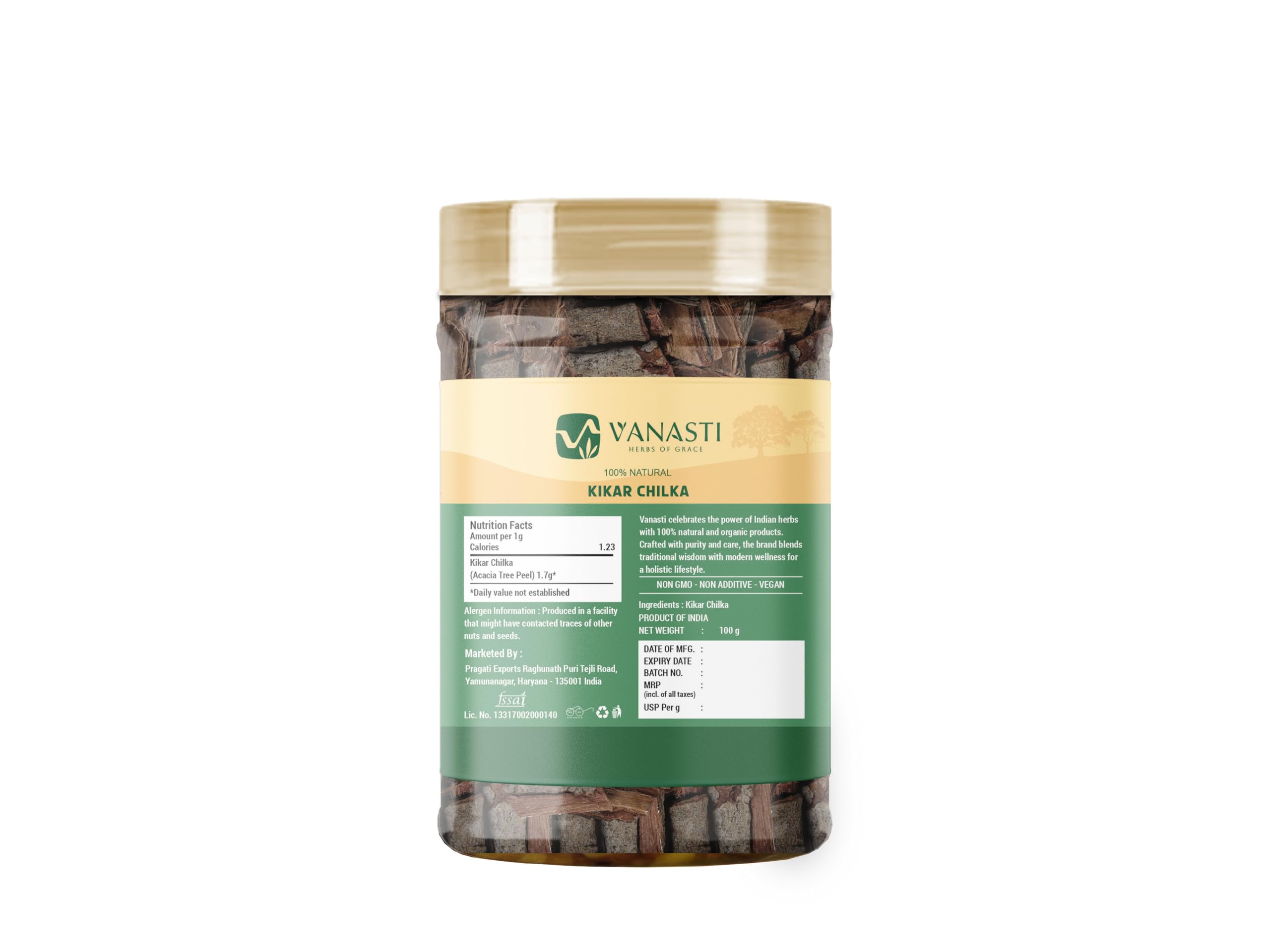 Kikar Chilka (Babool bark, Acacia arabica) comes from a thorny tree native to dry areas of the Indian subcontinent. The bark is rough and reddish-brown, while the tree also produces pods and gum. Rich in tannins, flavonoids, and saponins, it is used in natural tooth powders, herbal blends, and traditional crafts. Known for its astringent properties, Kikar Chilka is included in various preparations.