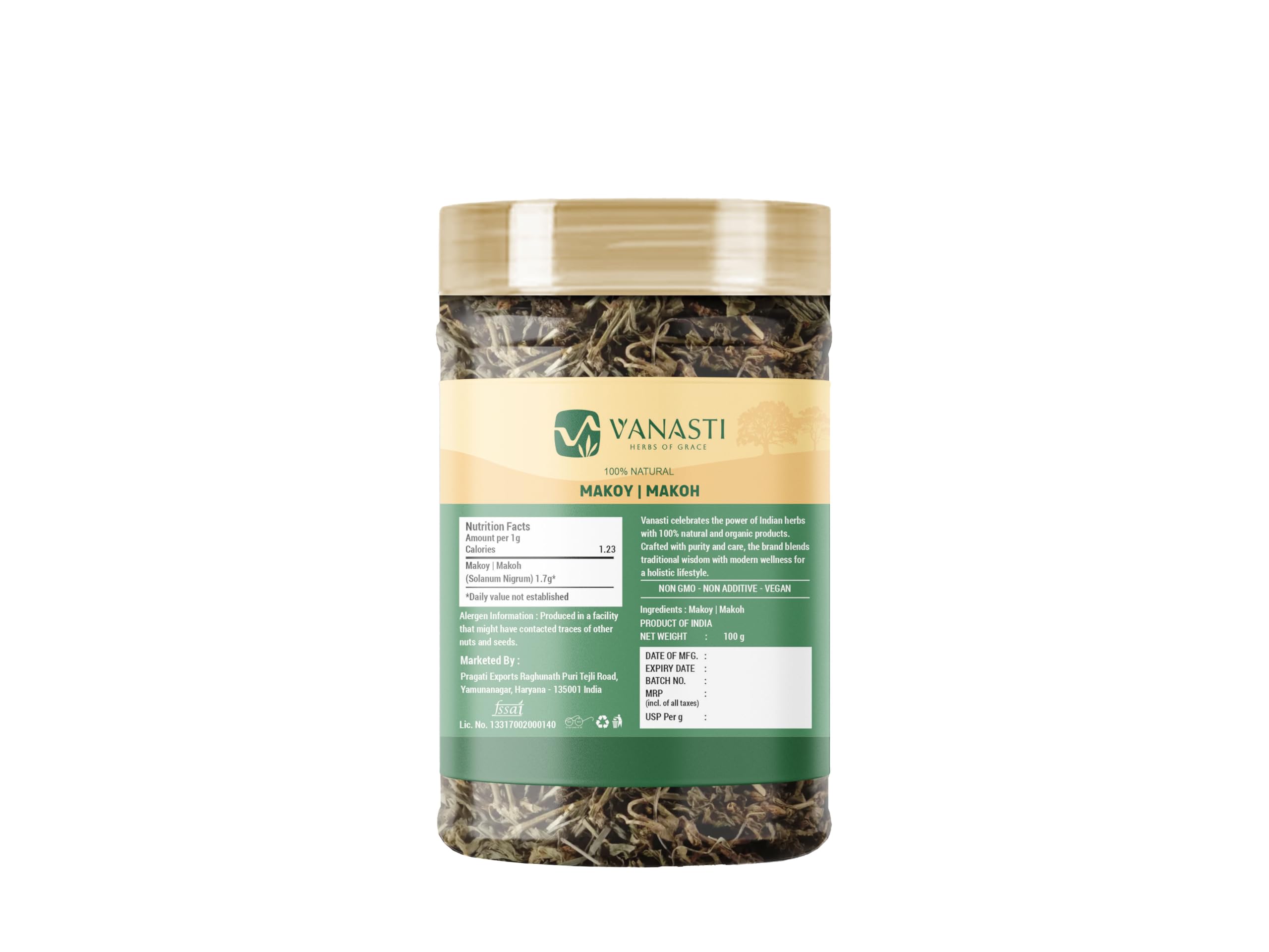 Makoy (also known as Makoh or Black Night Shade, Solanum nigrum) is a small leafy plant found in many parts of India and around the world. It grows tiny, round, black berries and has soft green leaves. The plant is known for being a natural source of vitamins A, C, and E, as well as minerals like calcium, magnesium, and iron. Makoy is often used in traditional recipes and herbal blends. Its mild taste and gentle texture make it a popular choice in both cooking and natural preparations.