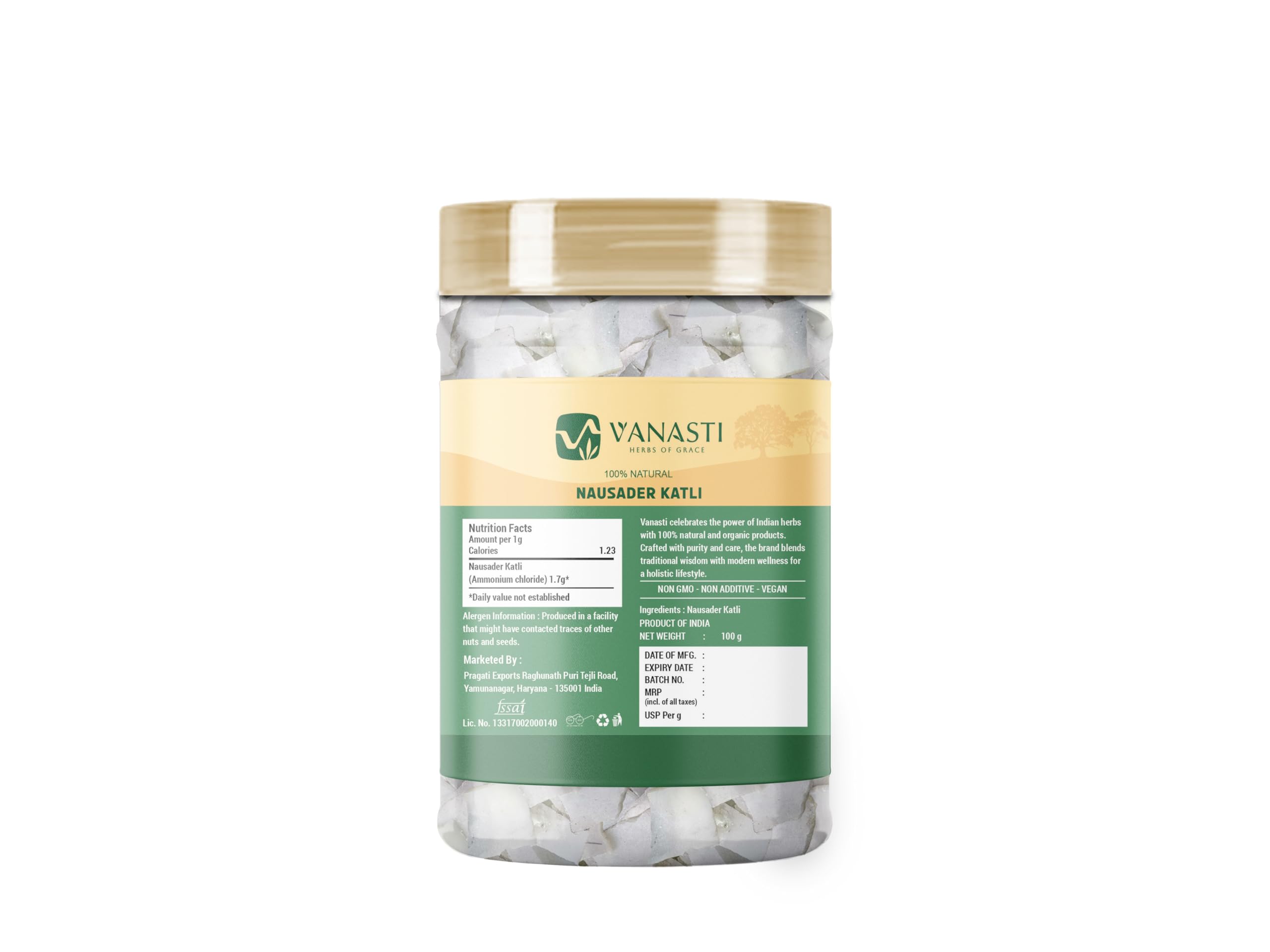 Nausader Katli (Nosader Katli, Ammonium Chloride) is a white, crystalline compound used in traditional Indian cooking, confectionery, and for cleaning brassware. It has a sharp, salty taste and dissolves easily in water. Nausader Katli is also found in some classic Ayurvedic preparations.