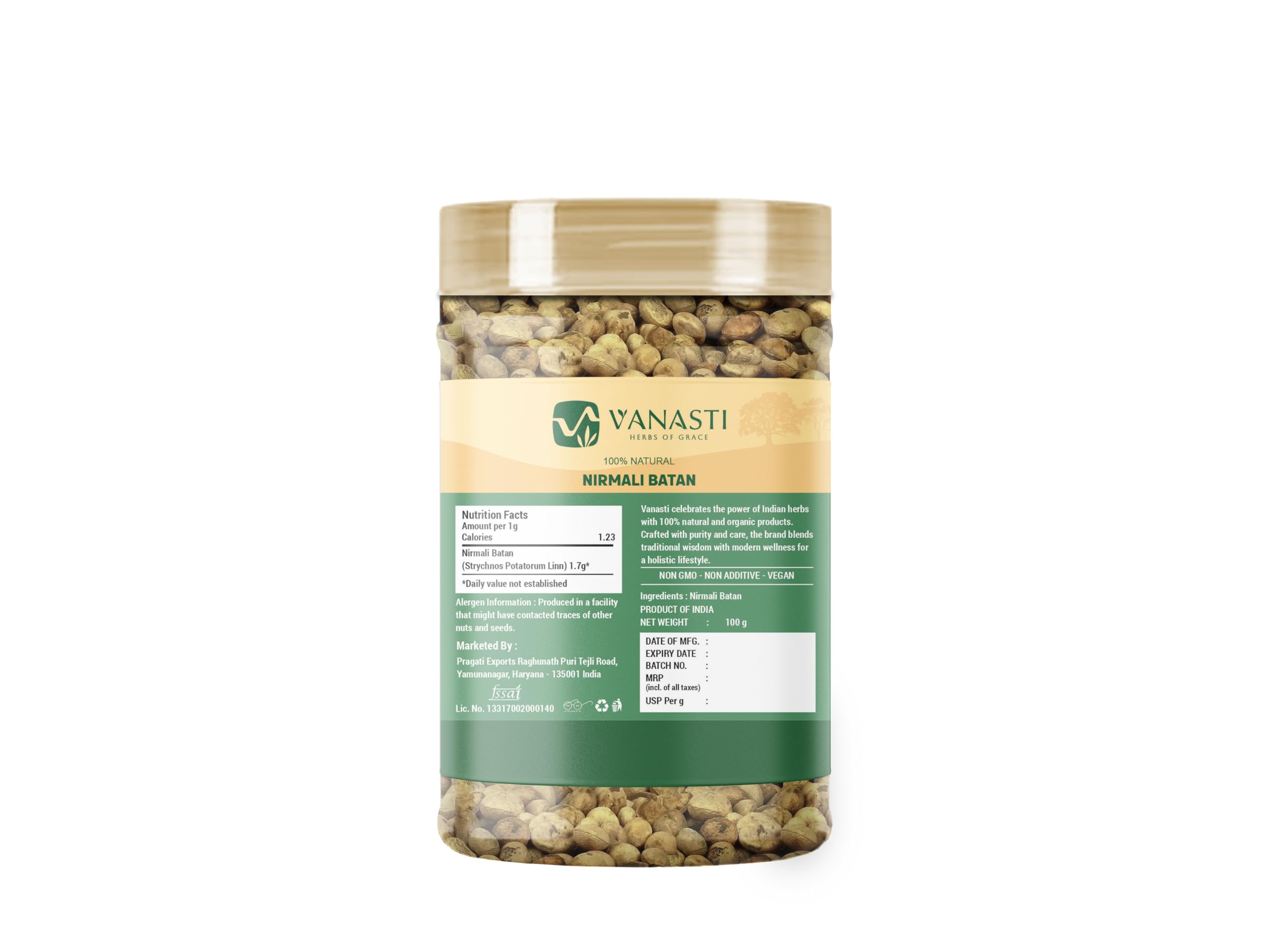 Nirmali Batan (Strychnos potatorum Linn) are the seeds of a tree native to India and parts of Asia. These small, hard seeds are traditionally used for natural water purification and are recognized for their unique ability to clarify turbid water. Nirmali seeds are also used in various traditional practices and preparations. They contain plant-based compounds, including alkaloids and tannins, and are valued for their distinctive properties in both culinary and household uses.