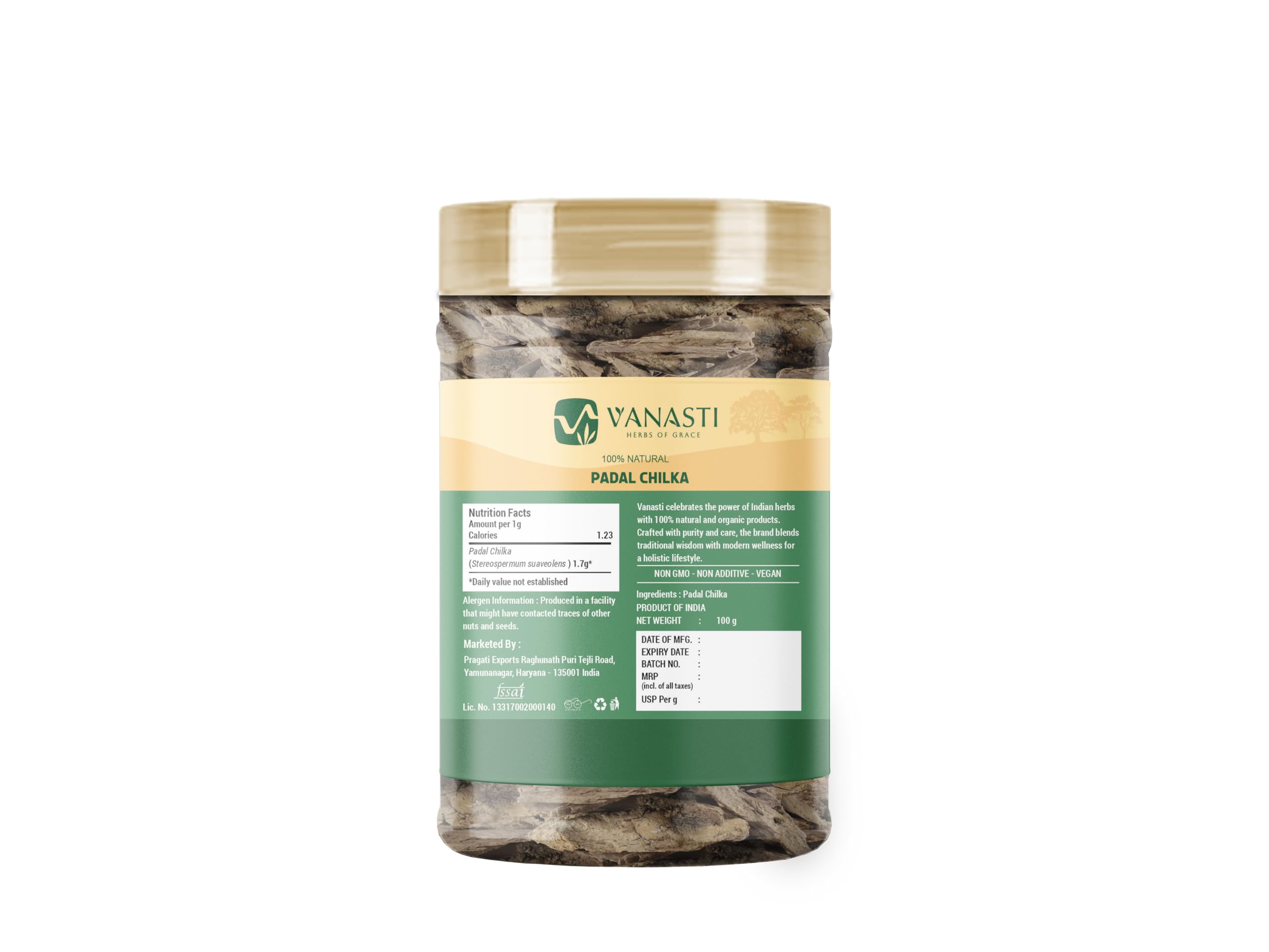 Padal Chilka (Padar Chilka) is the dried bark of the Stereospermum suaveolens tree, native to India and Southeast Asia. It is recognized for its light brown color and woody texture. Traditionally, Padal Chilka is used in herbal blends and natural preparations. The bark contains plant-based compounds such as tannins and flavonoids, and is valued for its unique properties in various classic recipes and traditional practices.