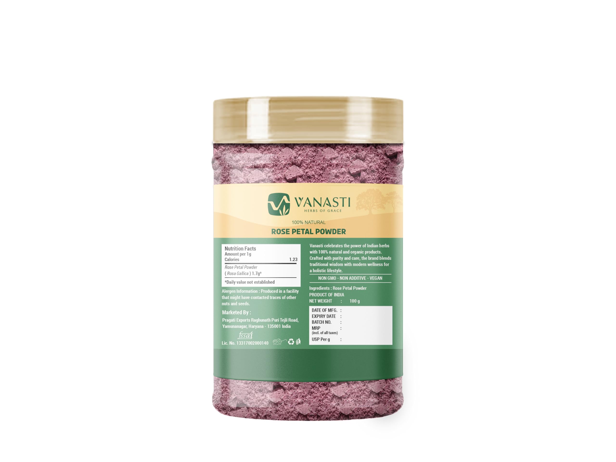 Gulab Patti (Rose Petal Powder) is made from dried petals of the Rosa gallica plant. This fragrant, pink-hued powder is used in teas, sweets, and natural beauty products. It contains plant-based compounds like flavonoids, essential oils, and vitamin C. Known for its pleasant aroma, it adds a gentle floral touch to both culinary and cosmetic uses.