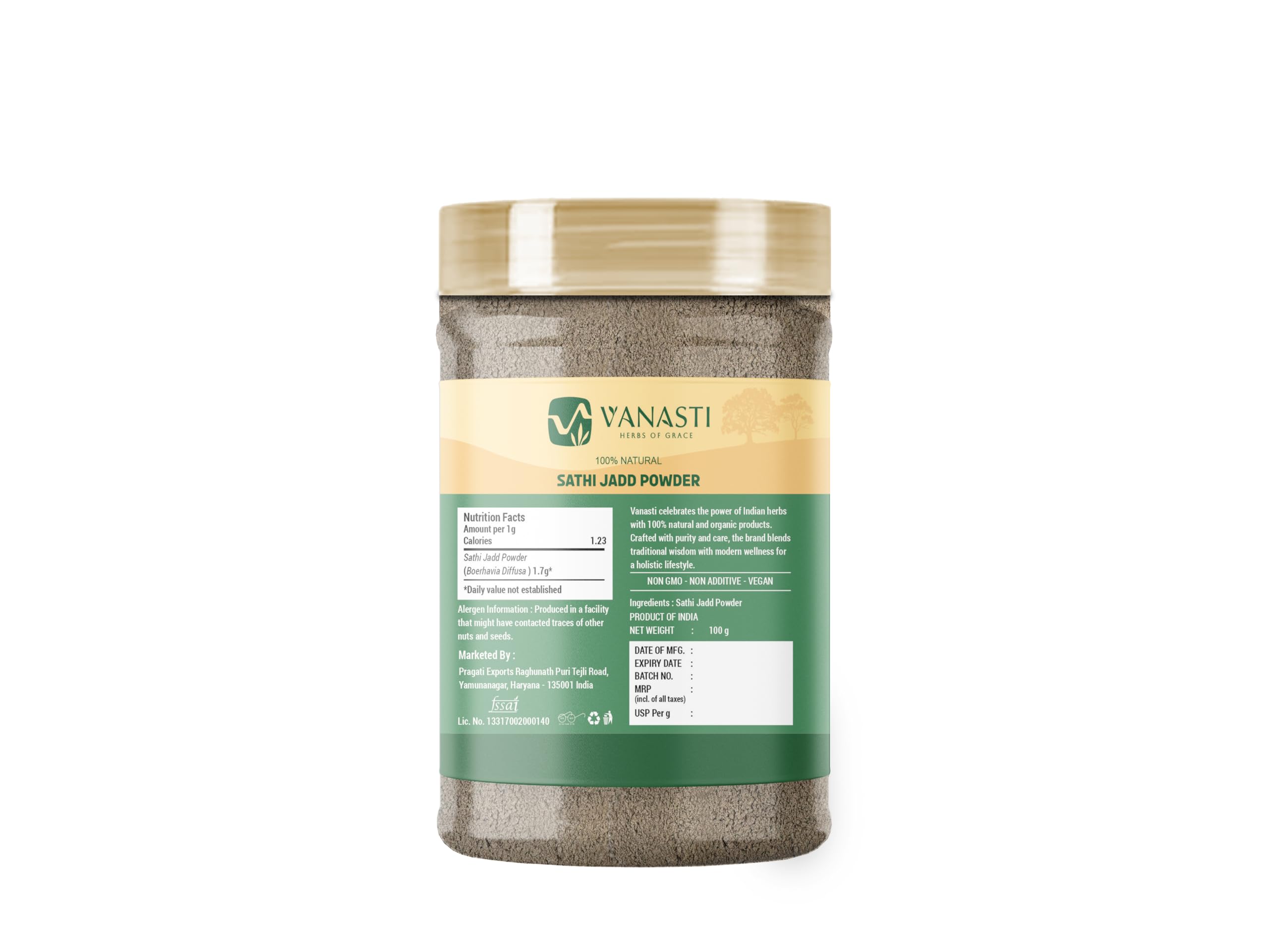 Sathi Jadd, also known as Punarnava or Boerhavia diffusa, contains natural plant compounds such as antioxidants, phytonutrients, and trace minerals. It is commonly featured in traditional herbal formulations. The herbs bioactive profile includes rotenoids and alkaloids, found in both roots and leaves. These constituents contribute to its unique botanical identity. Sathi Jadd is appreciated for its natural composition and is often included in nutrition-conscious product blends.
