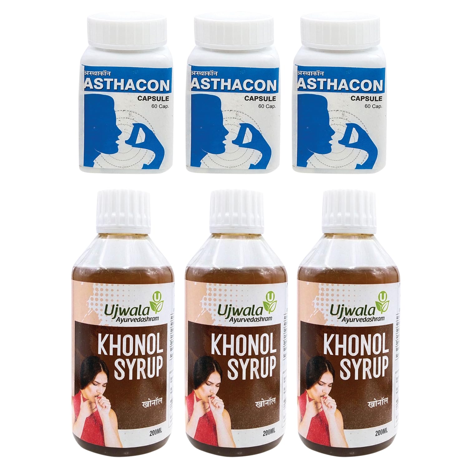 Asthacon Capsule And Khonol Syrup One Month Kit For Asthama Dry Cough Whopping Cough And Cold Bronchities And Shortness In Breath (6 intem in the set)