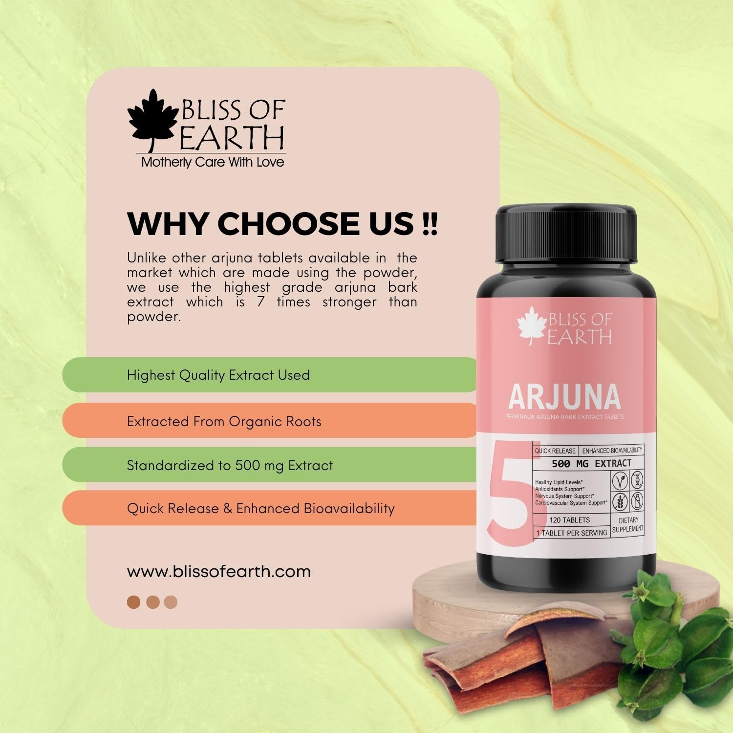 Experience the natural goodness of Moringa Oleifera with Bliss of Earth Moringa Tablets. Moringa often referred to as the "Miracle Tree" or "Drumstick Tree" has been cherished for centuries for its exceptional nutritional value and numerous health benefits. These 500mg Moringa tablets offer a convenient and potent way to enrich your daily wellness routine. & Bliss of Earth Arjuna scientifically known as Terminalia arjuna is a revered herbal supplement celebrated for its potential cardiovascular benefits. These Arjuna tablets offer a convenient and standardized way to incorporate the natural goodness of this traditional Ayurvedic herb into your daily wellness regimen.