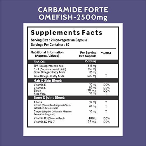 Carbamide Forte Fish Oil 2500mg- 60 Capsules| (Omega 3 1500mg; 900 mg EPA and 600mg DHA Per Serving) Capsule For Men & Women with Biotin Vitamin D Vitamin K2-MK7
