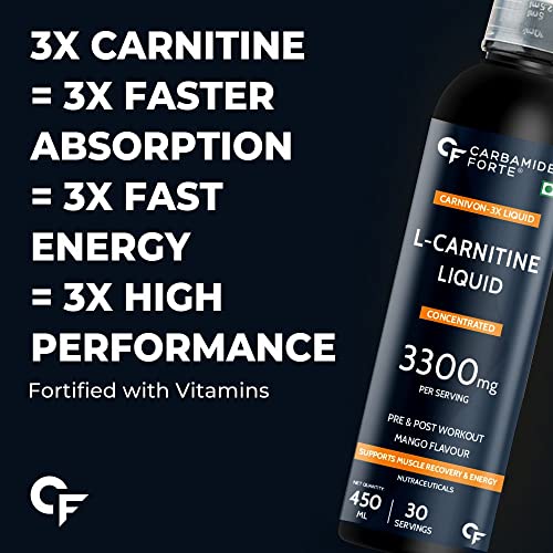 HomeHealth & PersonalDiet & NutritionHealth SupplementsCarbamide Forte L Carnitine Liquid 3300mg | L-Carnitine Supplement For Men & Women | Liquid L Carnitine Pre Workout, Intra Workout & Post Workout Supplement With 3300 mg Per Serving With Added Vitamins | L'Carnitine Mango Flavour With 30 Servings - 450ml