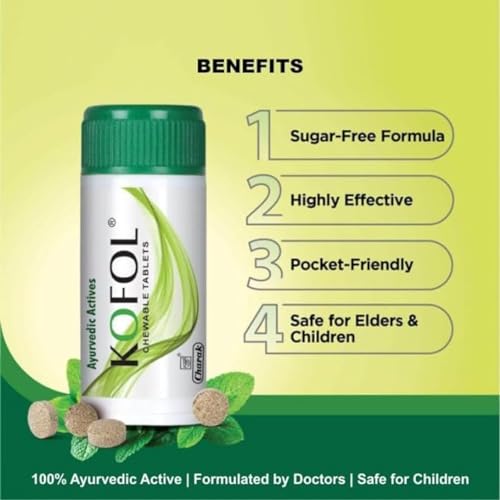 • Faster Relief from Sore Throat! Kofol Chewable Tablets of Charak are Ayurvedic tablets formulated to help in relieve the consumer from all the throat related problems like soreness pain cough etc. One pack of this medicine contains 60 tablets to help you